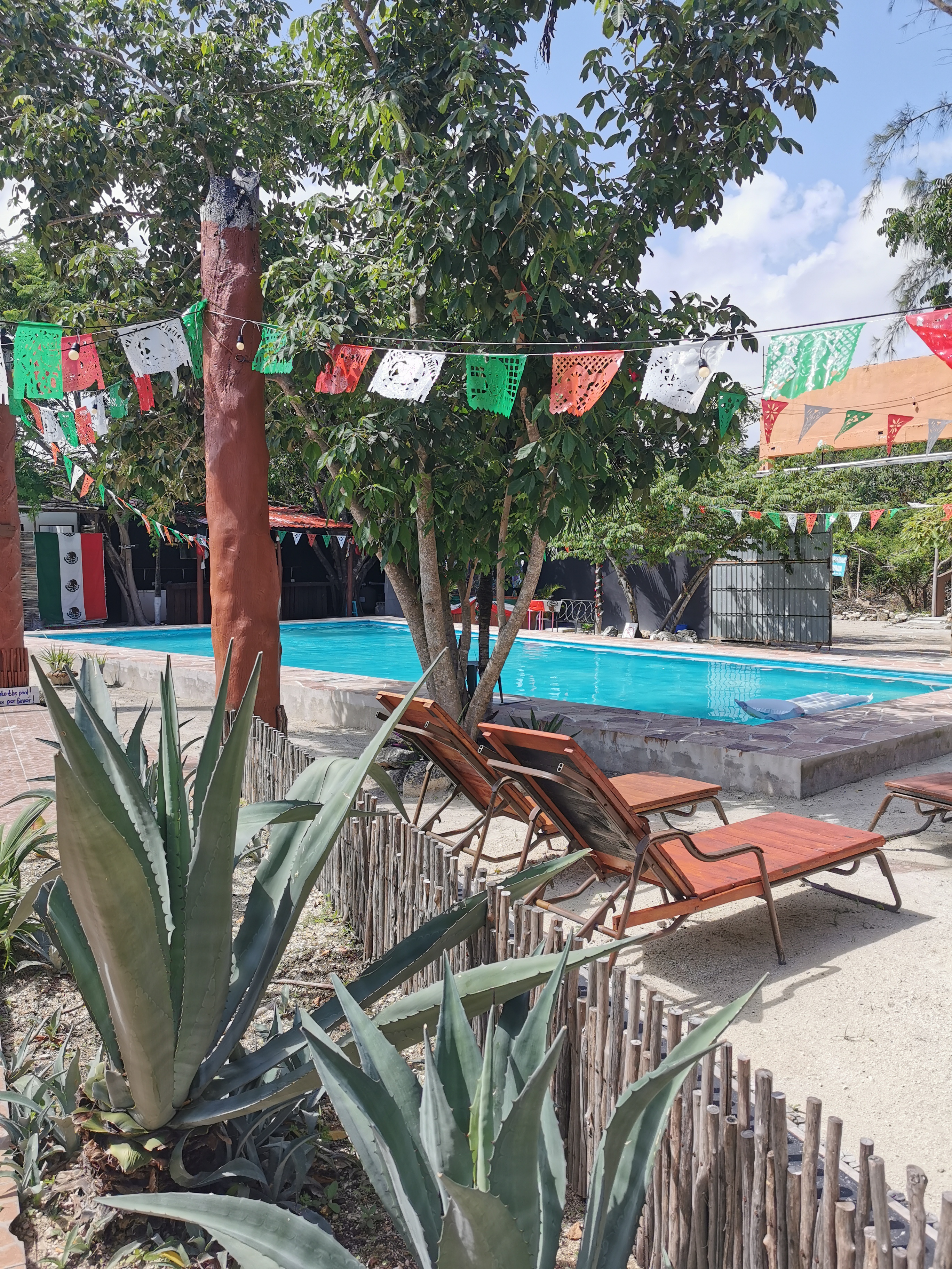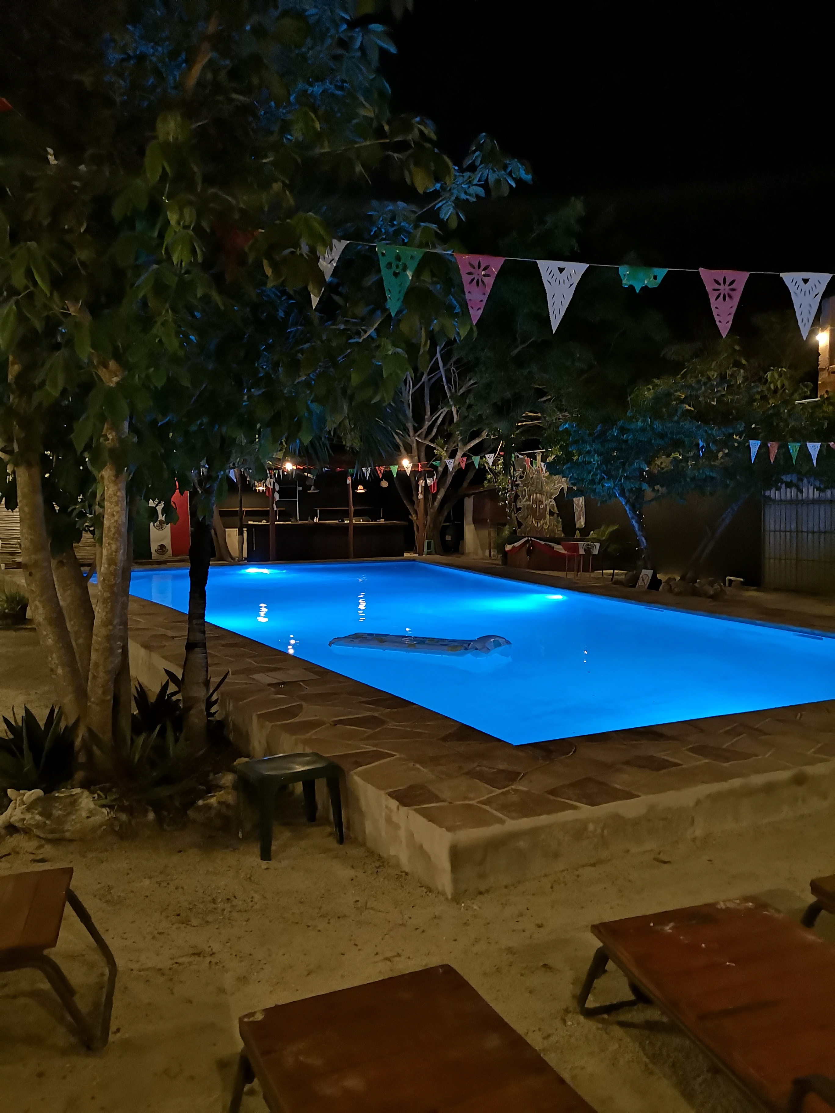 Also ging es per „Collectivo“ nach Tulum. Um zu den Collectivos zu gelangen brauchten wir ein Taxi. Ein paar Querstraßen von der Fußgängerzone entfernt sind die Taxis günstiger, wurde uns gesagt. Also gingen wir dort hin und winkten uns ein Taxi herbei. Als wir nach dem Preis fragten bekamen wir als Antwort: „150 Pesos“ (6,40 €) für eine Strecke von 10 Minuten. Das Angebot haben wie dankend abgelehnt und gingen weiter, sofort darauf wurden wir von einem anderen Taxi angehupt – hier mussten wir nur 50 Pesos (2,14 €) bezahlen. Es ist gut in den Unterkünften zu fragen wie viel ein Taxi kosten sollte, um sich nicht über den Tisch ziehen zu lassen. Collectivos sind Vans für ca. 15 Personen, die wie Shuttlebusse in nächstgelegene Städte fahren. In größeren Städten gibt es dafür Haltestellen man kann sich aber auch einfach an die Straße stellen, freundlich winken und schon wird man mitgenommen (sogar auf der Autobahn). Sie sind auch bei den Einheimischen sehr beliebt und wirklich günstig. Die Fahrt nach Tulum (ca. eine stunde Fahrt) hat uns 50 Pesos (2,14 €) pro Person gekostet. Untergekommen sind wir in der Unterkunft “The Free Hostel“ – vielleicht finden wir hier ja andere Backpacker und können Ideen austauschen. Bei mehreren Pools und einer gemütlichen Bar werden wir es uns gut gehen lassen und hoffen, dass wir bald ein paar Ausflüge machen können.