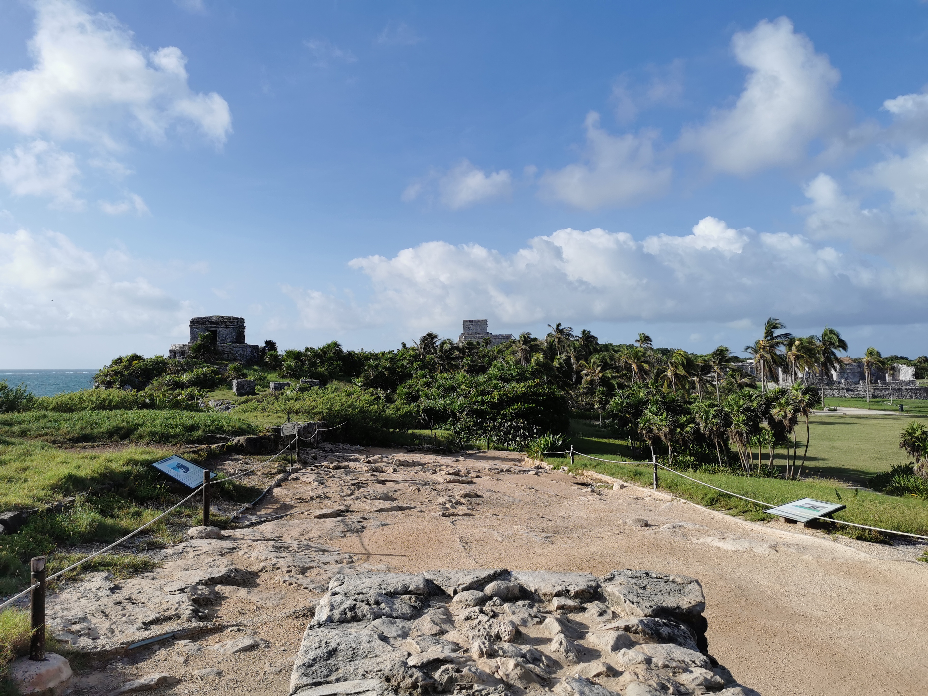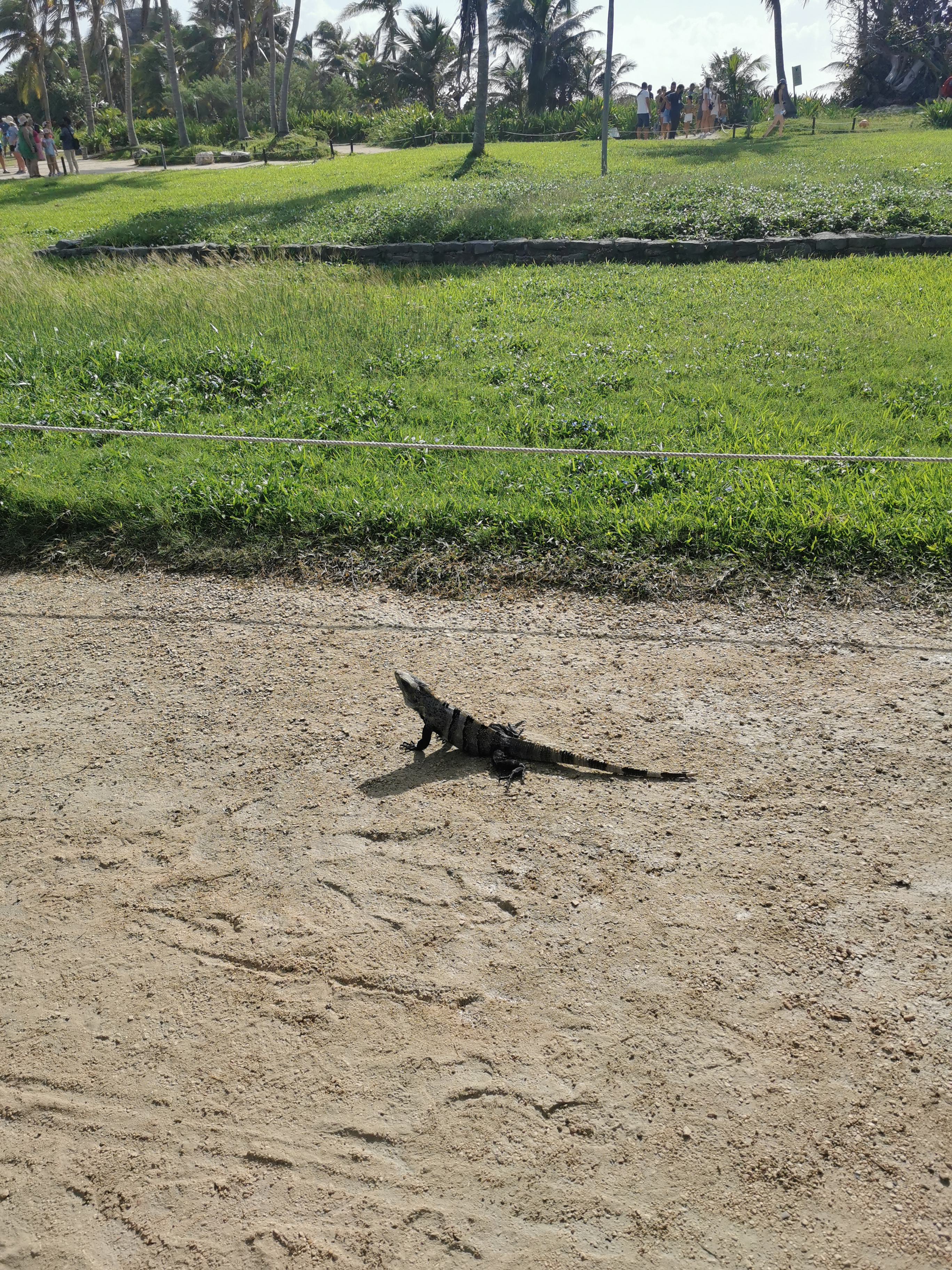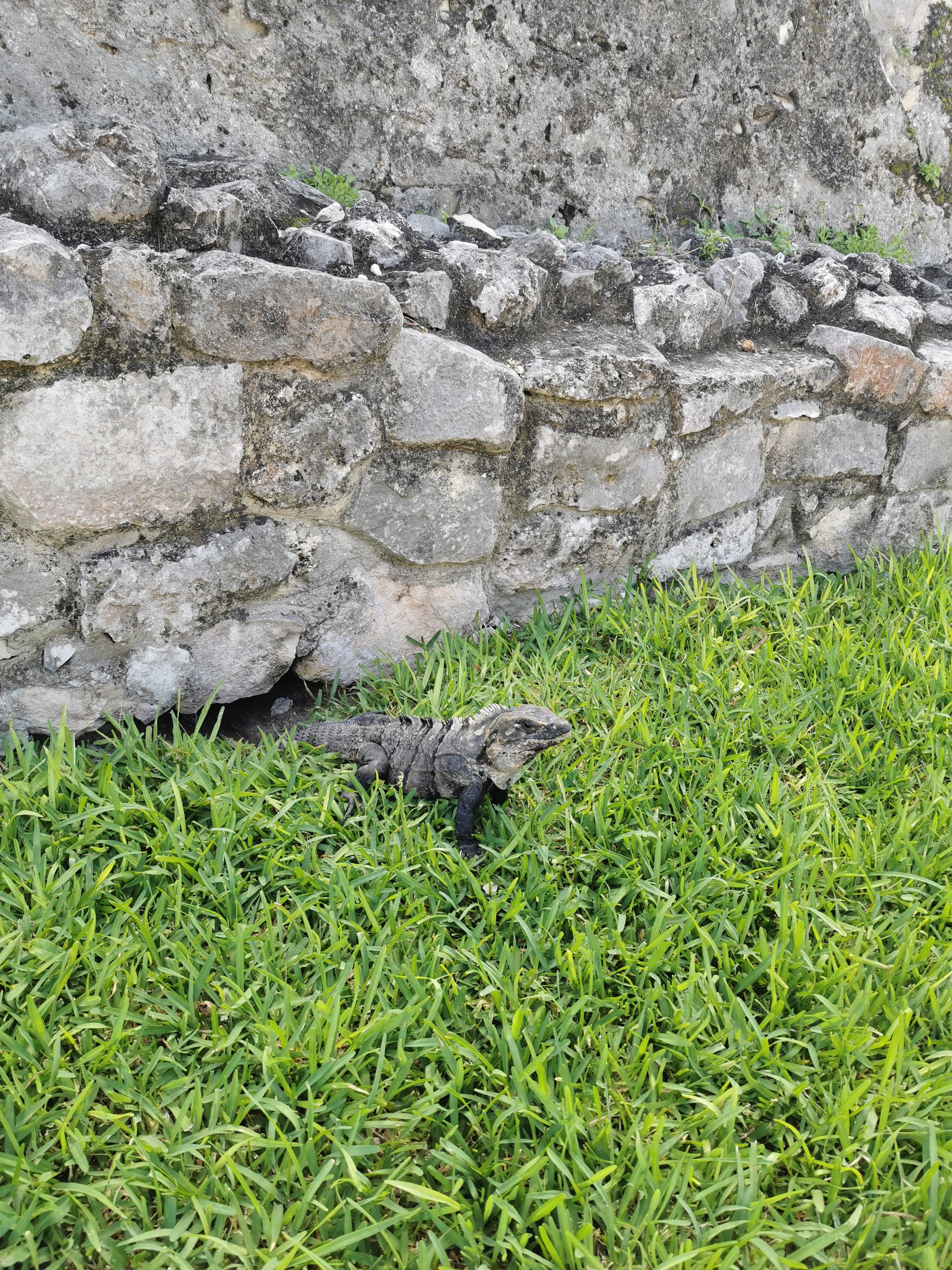Nach zehn Tagen Pause ohne Ausflüge um Connys Fuß möglichst gut abheilen zu lassen, haben wir uns heute auf den Weg zu den Maya-Ruinen hier in Tulum gemacht. Zum Glück ist unser Hotel nur 15 Gehminuten vom Eingang der Ruinen entfernt. Überall liest man, dass man möglichst früh bei den Ruinen sein soll, da ab ca. 9:00 Uhr morgens die Touristen mit großen Reisebussen angekarrt werden. Also haben wir uns schon um 7:30 Uhr auf den Weg gemacht. Zum Frühstück gab es nur ein Sandwich und ein paar Bananen, welche wir am Weg in einem kleinen Supermarkt gekauft haben. Am Eingang angekommen haben wir uns zwei Tickets für 160 Pesos (6,70 €) gekauft. Wie auf dem zweiten Bild ersichtlich sind die gesamten Ruinen mit einer Mauer geschützt. Also gings drunter durch und wir kamen aus dem Staunen nicht mehr raus. Ein Blick auf ein wunderschönes Areal und das Rauschen der Wellen die auf die Küste treffen versetzen einen in eine ganz besondere Atmosphäre. Viele Ruinen (Steinhaufen) sind überall verteilt und jede hat ihre eigene Geschichte. Vom Tempel mit Altar bis hin zur Schlafstätte der wichtigen Personen des Stammes. Besonders ist einfach die Lage – direkt an der Küste auf einem kleinen Hügel, oder wie es auf der Maya-Touristen Tafel stand – dort wo die Sonne als erstes im Land aufgeht. Eine Informationstafel mit einem kleinen Gedankenspiel hat mir besonders gefallen. Ihr findet sie unten bei den Bildern. Beim Schlendern durch das ganze Areal haben wir immer wieder Leguane gesehen. Klar war uns bewusst, dass diese hier in Mexiko heimisch sind aber mit dieser Häufigkeit wie sie hier bei den Ruinen vertreten waren, haben wir nicht gerechnet. Ob auf dem Weg, zwischen den Steinen oder auf den Bäumen sitzend. Man sieht sie einfach überall. Auf dem Weg zum Ausgang haben wir gewusst warum wir so „früh“ aufgestanden sind. Hunderte von Menschen überall wo man hin sah. Allein die Schlange vor dem Eingang war mindestens 60 Meter lang. Auf halbem Weg zur Unterkunft mussten wir noch einmal an den ganzen schreienden Männern alias Parkplatzwärtern vorbei. Rund 15 Männer stehen an der Zufahrtsstraße zu den Ruinen und schreien jedes vorbeifahrende Auto an. „He, stop the car ; Attention you are not allowed to drive here“ und vieles mehr. Alles Blödsinn. Die wollen dir einfach nur einen Parkplatz gegen viel Geld andrehen. Achja. Connys Fuß wird immer besser und die zwei Stunden spazieren waren überhaupt kein Problem. Trotzdem verbringen wir den restlichen Tag sicherheitshalber am Pool. Man solls ja nicht gleich übertreiben 😅