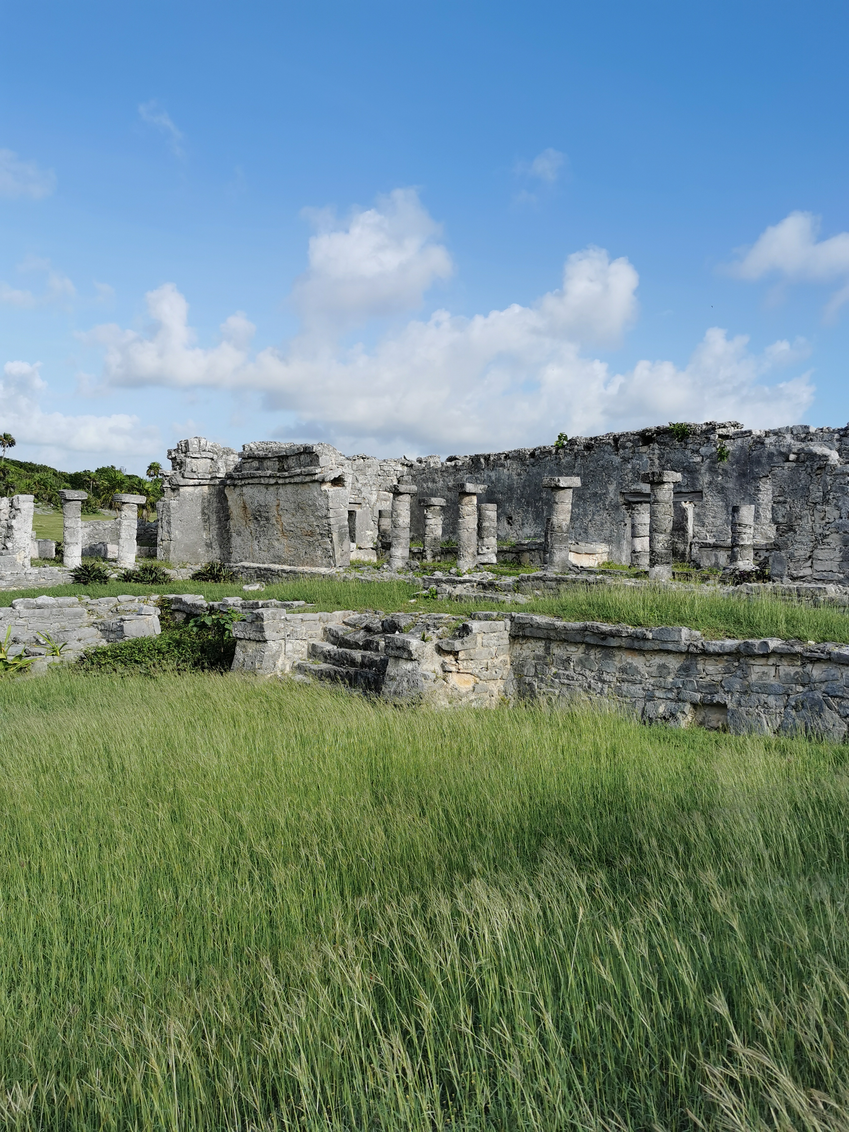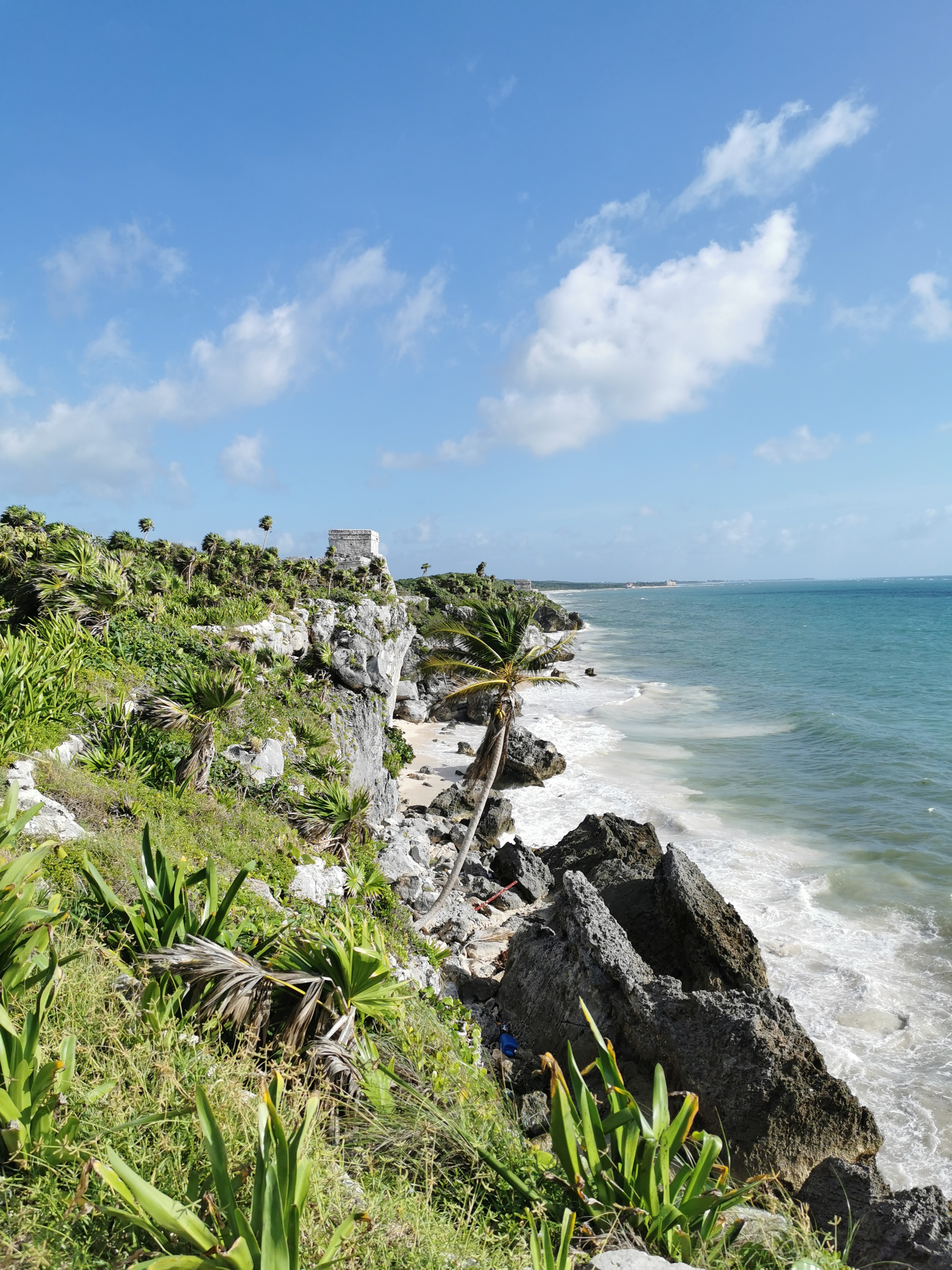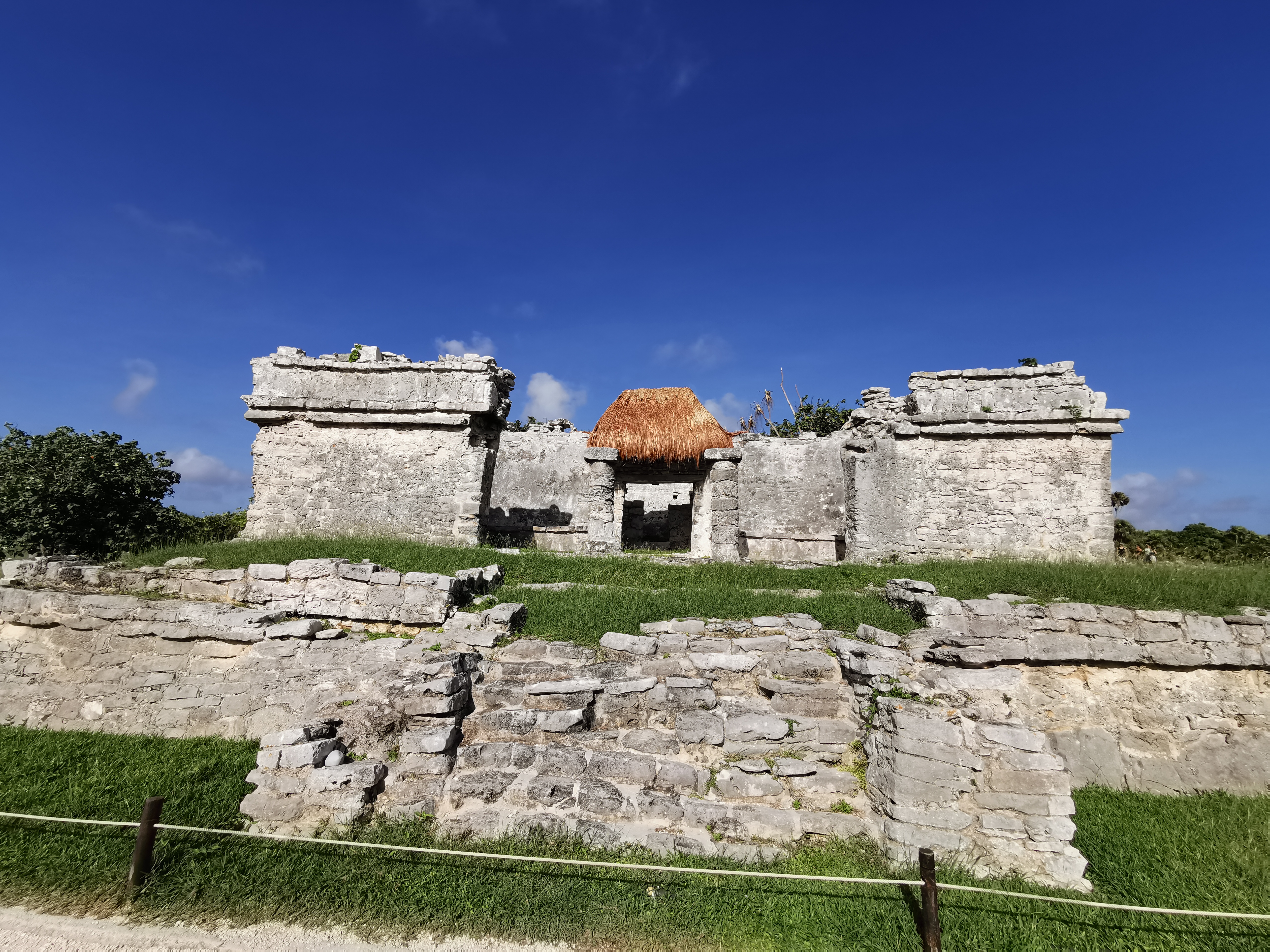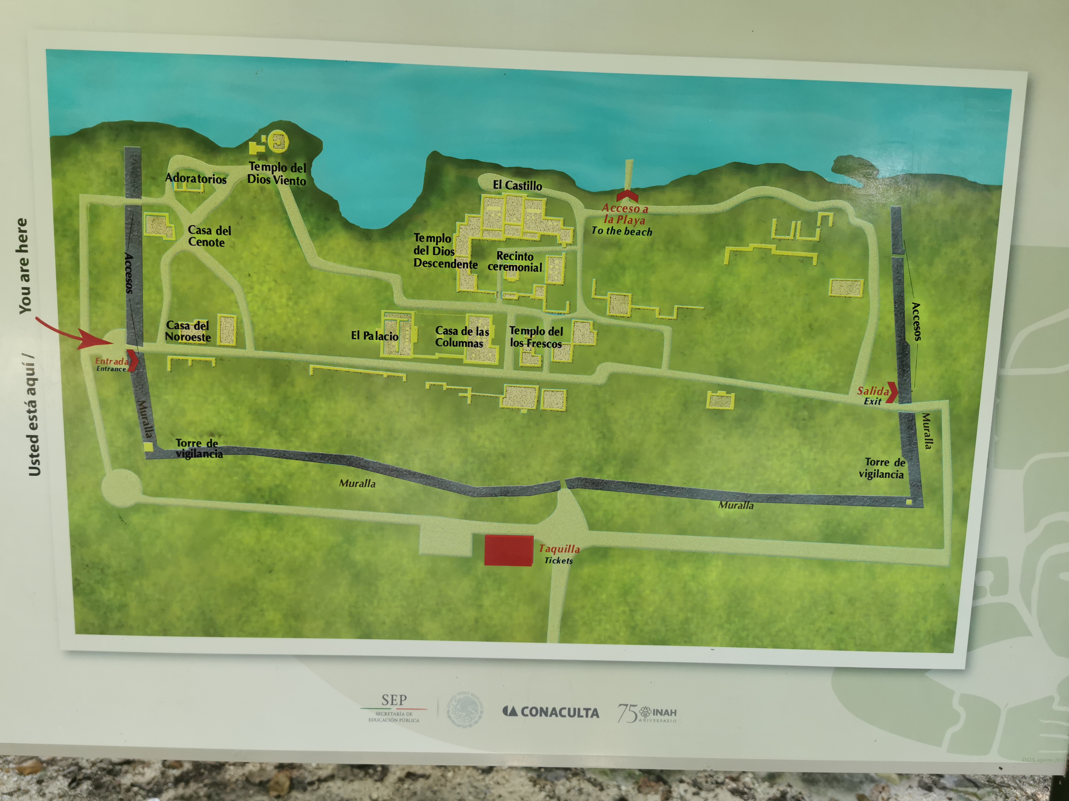 Nach zehn Tagen Pause ohne Ausflüge um Connys Fuß möglichst gut abheilen zu lassen, haben wir uns heute auf den Weg zu den Maya-Ruinen hier in Tulum gemacht. Zum Glück ist unser Hotel nur 15 Gehminuten vom Eingang der Ruinen entfernt. Überall liest man, dass man möglichst früh bei den Ruinen sein soll, da ab ca. 9:00 Uhr morgens die Touristen mit großen Reisebussen angekarrt werden. Also haben wir uns schon um 7:30 Uhr auf den Weg gemacht. Zum Frühstück gab es nur ein Sandwich und ein paar Bananen, welche wir am Weg in einem kleinen Supermarkt gekauft haben. Am Eingang angekommen haben wir uns zwei Tickets für 160 Pesos (6,70 €) gekauft. Wie auf dem zweiten Bild ersichtlich sind die gesamten Ruinen mit einer Mauer geschützt. Also gings drunter durch und wir kamen aus dem Staunen nicht mehr raus. Ein Blick auf ein wunderschönes Areal und das Rauschen der Wellen die auf die Küste treffen versetzen einen in eine ganz besondere Atmosphäre. Viele Ruinen (Steinhaufen) sind überall verteilt und jede hat ihre eigene Geschichte. Vom Tempel mit Altar bis hin zur Schlafstätte der wichtigen Personen des Stammes. Besonders ist einfach die Lage – direkt an der Küste auf einem kleinen Hügel, oder wie es auf der Maya-Touristen Tafel stand – dort wo die Sonne als erstes im Land aufgeht. Eine Informationstafel mit einem kleinen Gedankenspiel hat mir besonders gefallen. Ihr findet sie unten bei den Bildern. Beim Schlendern durch das ganze Areal haben wir immer wieder Leguane gesehen. Klar war uns bewusst, dass diese hier in Mexiko heimisch sind aber mit dieser Häufigkeit wie sie hier bei den Ruinen vertreten waren, haben wir nicht gerechnet. Ob auf dem Weg, zwischen den Steinen oder auf den Bäumen sitzend. Man sieht sie einfach überall. Auf dem Weg zum Ausgang haben wir gewusst warum wir so „früh“ aufgestanden sind. Hunderte von Menschen überall wo man hin sah. Allein die Schlange vor dem Eingang war mindestens 60 Meter lang. Auf halbem Weg zur Unterkunft mussten wir noch einmal an den ganzen schreienden Männern alias Parkplatzwärtern vorbei. Rund 15 Männer stehen an der Zufahrtsstraße zu den Ruinen und schreien jedes vorbeifahrende Auto an. „He, stop the car ; Attention you are not allowed to drive here“ und vieles mehr. Alles Blödsinn. Die wollen dir einfach nur einen Parkplatz gegen viel Geld andrehen. Achja. Connys Fuß wird immer besser und die zwei Stunden spazieren waren überhaupt kein Problem. Trotzdem verbringen wir den restlichen Tag sicherheitshalber am Pool. Man solls ja nicht gleich übertreiben 😅