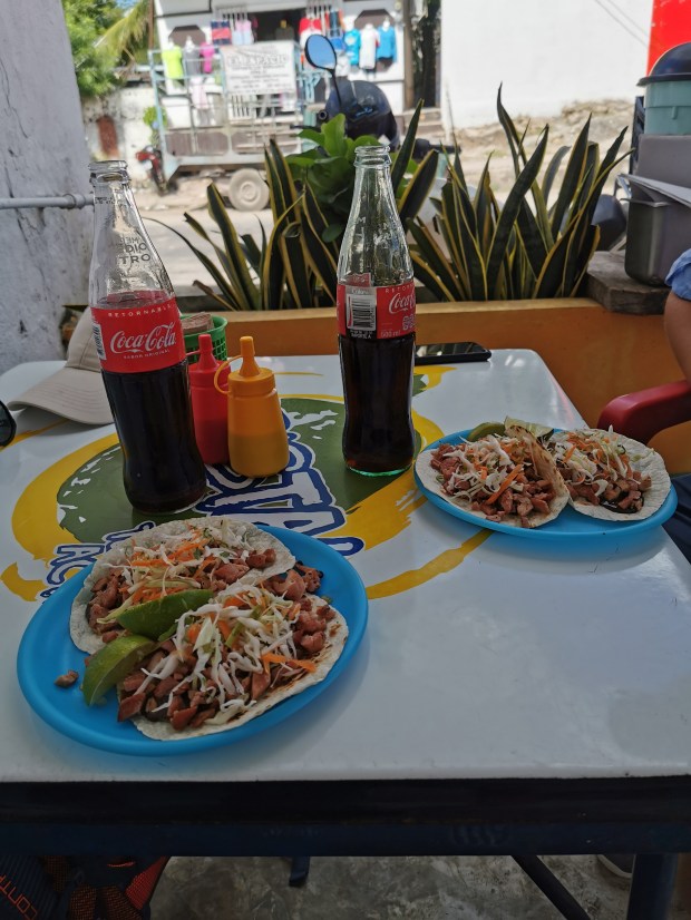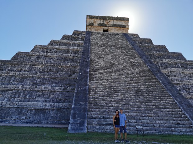 Um 7 Uhr ging es für uns mit dem Colectivo nach Chichén Itzá (40 Pesos = 1,67 € pro Person). Kurz nach 8 Uhr kamen wir dort an und es war schon einiges los. Der Eintrittspreis für 2 Personen betrug 1066 Pesos (44,70€), ist halt ein Weltwunder. Nach dem Ticketkauf kam schon die erste Hürde, denn man darf kein Essen mit hinein nehmen. Tja, wir hatten uns extra eine kleine Jause besorgt. Diese mussten wir noch schnell auf den vollen Magen – wir hatten kurz davor gefrühstückt – stopfen. Danach wurde unser Rucksack durchsucht und wir mussten für unsere GoPro nochmal 50 Pesos (2,20 €) zusätzlich bezahlen. So ein Weltwunder ist ja schön, aber Essen wegschmeißen und für eine Kamera extra bezahlen finden wir schon übertrieben. Naja, nachdem wir dann endlich drin waren, kamen wir aus dem Staunen nicht mehr heraus. Diese riesige Pyramide in der Mitte war einfach atemberaubend. Neben den schönen Ruinen gibt es auch unmenschlich viele Souvenirstände. Von allen Seiten hörte man “One Dollar“, “Get some souvenir“, “Good price“. Wir sind für ca. zwei Stunden über das sehr weitläufige Gelände spaziert, dann hatten wir genug von den Steinen 😅 Mit dem Bus sind wir nun wieder zurück in die Stadt gefahren (37 Pesos = 1,55€ pro Person). Dort haben wir noch einen kleinen netten Taco-Stand gefunden und gut gegessen. Nach der Stärkung mussten wir allerdings nochmal drei Kilometer gehen, um endlich unsere Wäsche abzuholen (8,8kg für 135 Pesos = 5,65€). Nach diesem heißen Tag und den vielen Kilometern in den Beinen waren wir ziemlich müde. Abends haben wir uns noch etwas gekocht und gingen früh ins Bett.