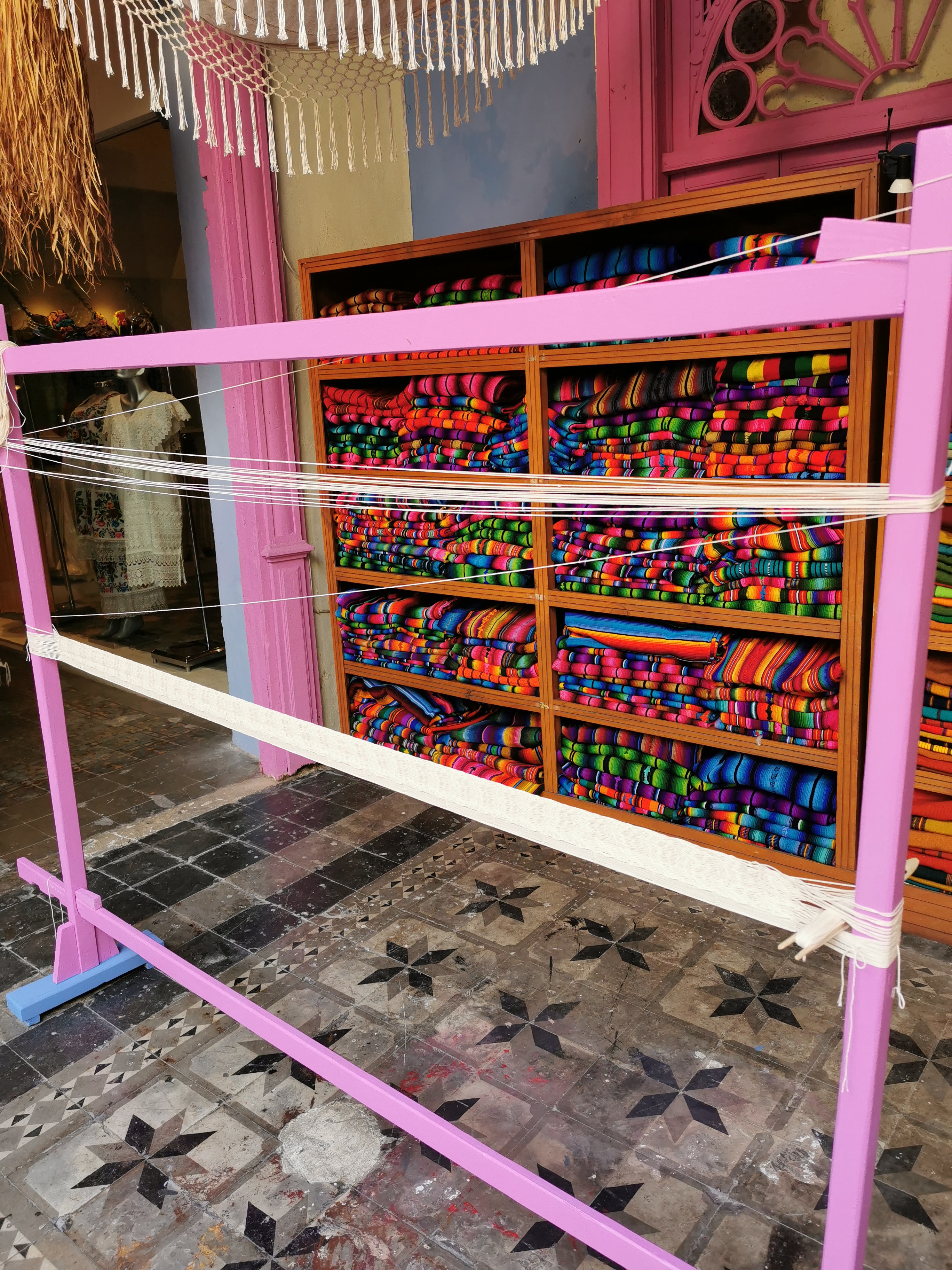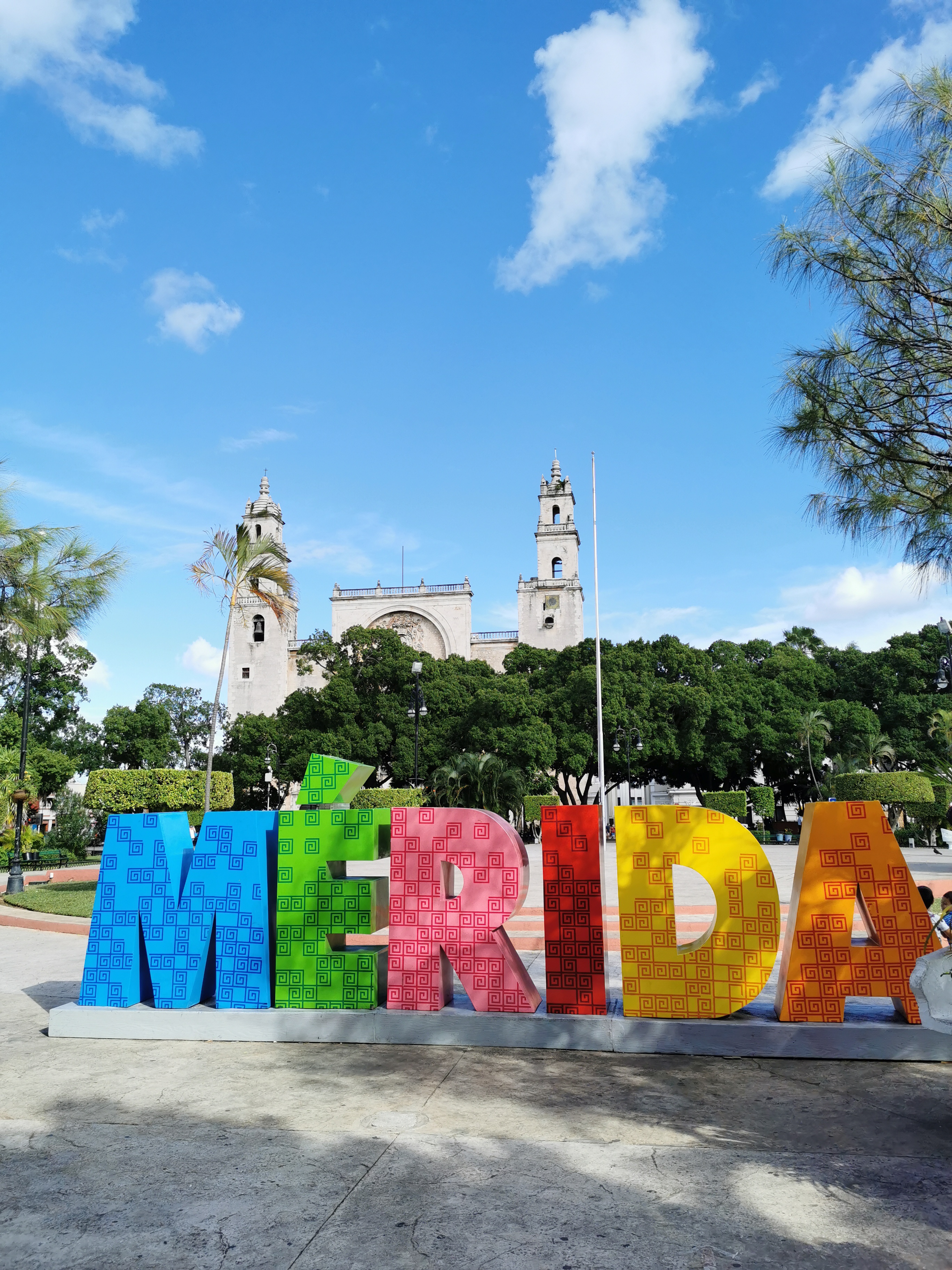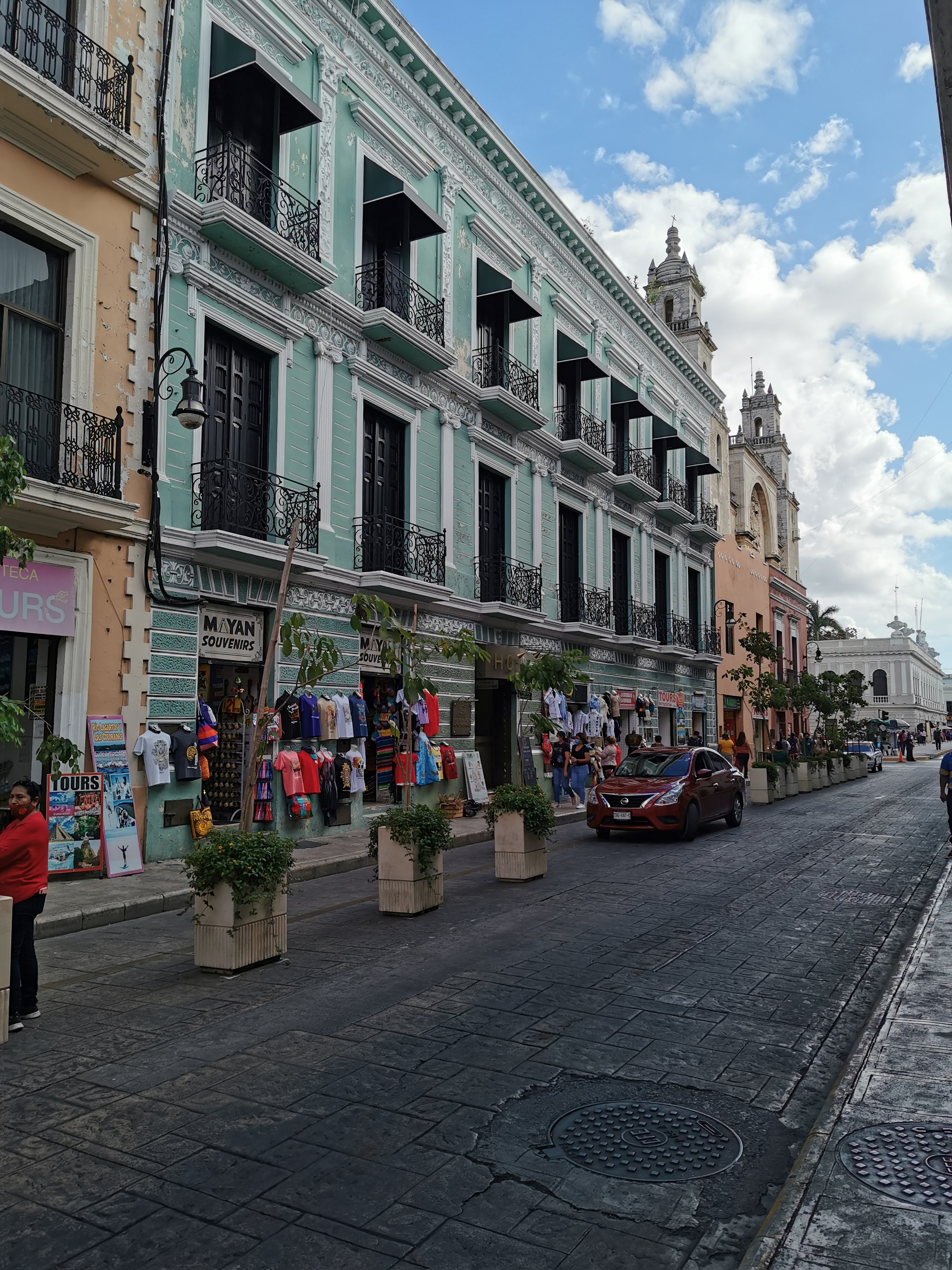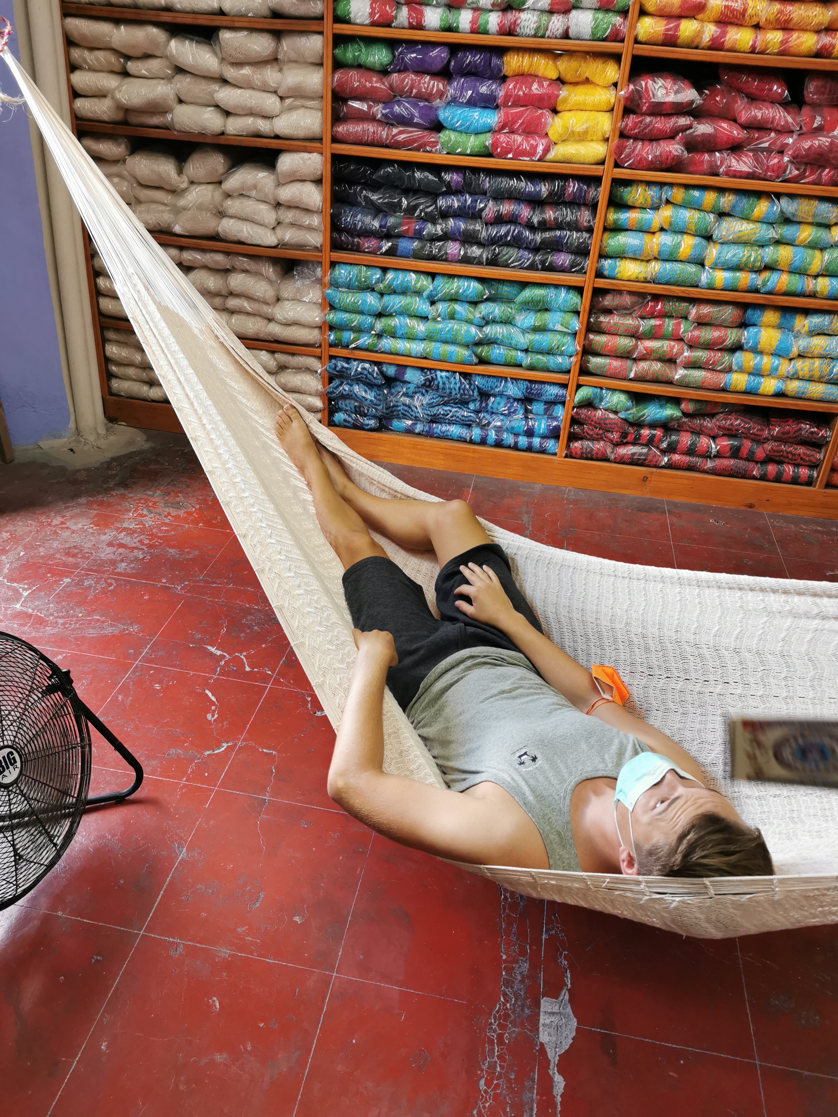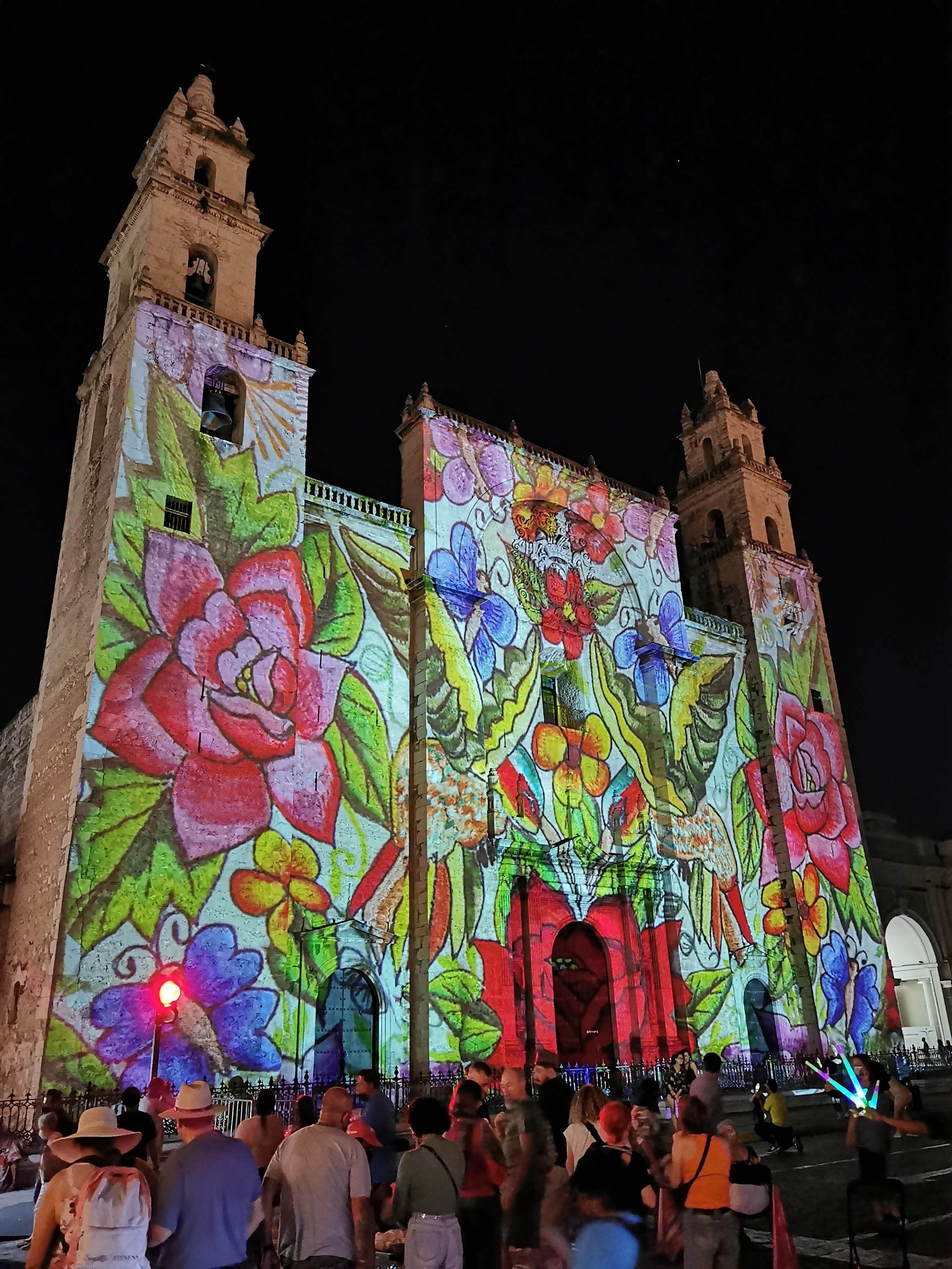 Unsere Reise ging weiter nach Mérida und wir hatten Glück, denn unser Vermieter unserer Unterkunft in Valladolid war so nett und nahm uns mit seinem Auto mit nach Mérida. Gut für uns, so sparten wir uns den Bus. 😁 Nach zweienhalb Stunden Fahrt sind wir angekommen. Die ehemalige Kolonialstadt ist eine der sichersten Städte Mexikos. Am ersten Abend gingen wir in einen riesigen Walmart, der ganz in der Nähe unserer Unterkunft war, um für Frühstück und Abendessen einkaufen. Im Supermarkt konnte man endlich wieder nach europäischer Gewohnheit einkaufen. Um zu unserer Unterkunft zurück zu kommen, nahmen wir den Fahrtendienst eines Einheimischen an. Dieser fuhr mit seiner „APE“ (siehe Bilder) als Taxi herum, um ein wenig Geld zu verdienen. Nach anfänglichen Startschwierigkeiten, das Gefährt wollte nicht anspringen, waren wir dann doch ziemlich schnell auf den holprigen Straßen unterwegs. Am nächsten Morgen ging es mit dem Bus für 8 Pesos = 0,35 € pro Person ins Stadtzentrum von Mérida. Dort haben wir einen netten Einheimischen getroffen, der uns gleich Tipps für die Stadt und das Abendprogramm gab. Auf seine Empfehlung gingen wir in den „Mercado Principal“, das ist ein berühmter Mayamarkt hier in Mérida. Auf diesem Markt werden Hängematten, Decken, Teppiche und vieles mehr aus Sisalfasern, die mit Baumwolle gemischt werden, in Handarbeit hergestellt. Wir bekamen eine ausführliche Erklärung, wie Hängematten hergestellt werden und einen kurzen Einblick in die Mayakultur. Was für uns unvorstellbar war, ist, dass Familien aus der Mayakultur kein Bett besitzen, sondern ihr Leben lang in Hängematten schlafen. In unserer Vorstellung liegt man wie eine Banane in einer Hängematte, hier allerdings sind sie so groß, dass man diagonal liegen kann. Da unser Gepäck randvoll ist, mussten wir den Markt leider mit leeren Händen verlassen. Anschließend schlenderten wir durch die Straßen und bewunderten die Architektur. Am Abend wurde auf der Fassade der Kathedrale eine Lichtshow gezeigt. Es war sehr beeindruckend anzusehen und danach gingen wir in eine Bar mit Livemusik und ließen den Abend gemütlich mit einem Cocktail ausklingen.