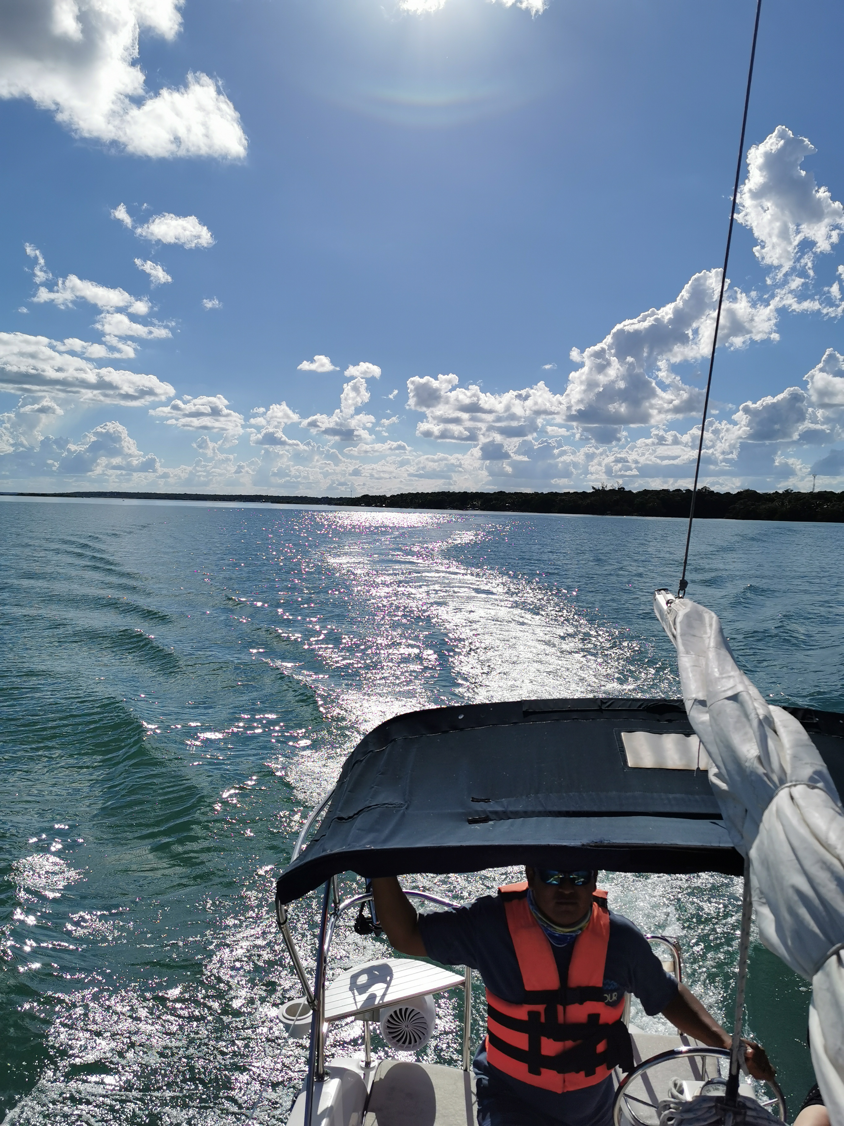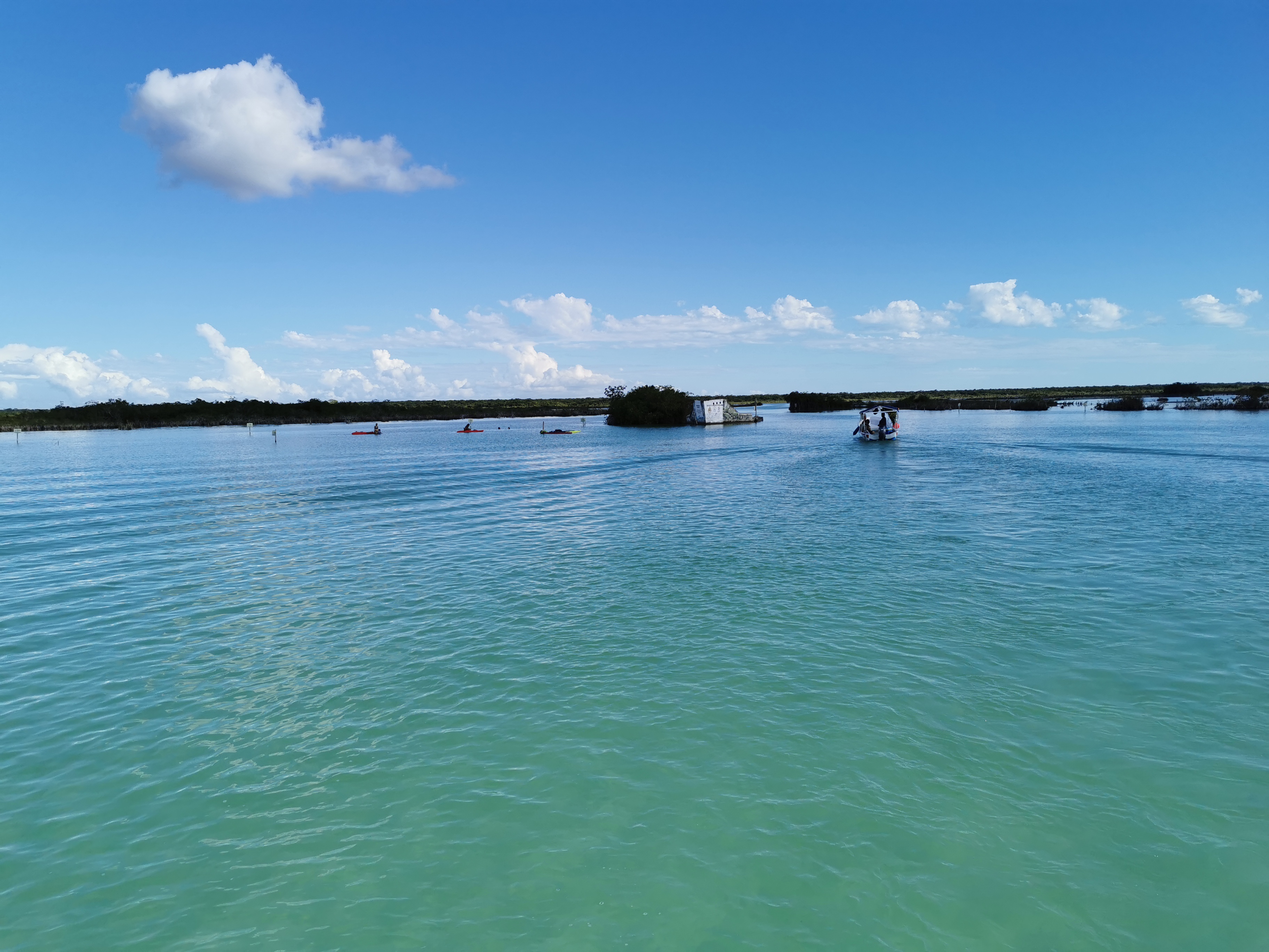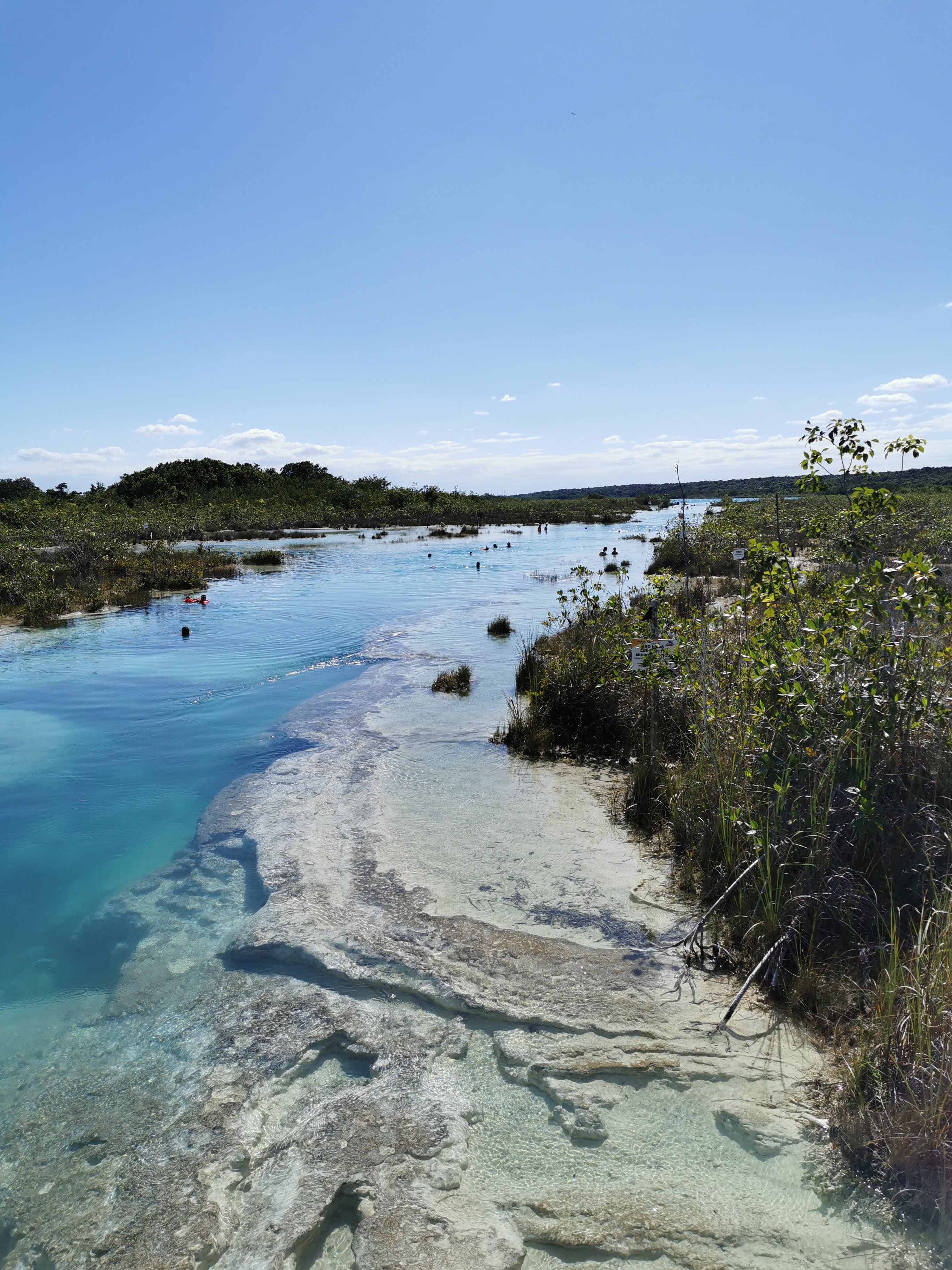 An einem anderen Tag waren wir schwimmen im „Los Rapidos“. Mit dem Colectivo fuhren wir Richtung Chetumal und baten den Fahrer, uns nach Los Rapidos (eine genauere Bezeichnung hatten wir nicht für ihn) zu bringen und nach ca. 20 Minuten Fahrt und 20 Pesos = 0,85€ (für 2 Personen) kamen wir an. Der Nachteil war, dass wir noch 2km zu Fuß bis zum Eingang gehen mussten. Zum Glück trafen wir auf der Hälfte der Strecke nette Kanadier, die uns mitgenommen haben. Nachdem wir endlich am Eingang angekommen waren, mussten wir 150 Pesos = 6,36 € pro Person Eintritt bezahlen. Das Areal ist schön angelegt, es gibt ein Restaurant und viele Sitzgelegenheiten. Los Rapidos ist ein schmaler Verbindungskanal zweier Lagunen, der ebenfalls in wunderschönen Blautönen erstrahlt und von kleinen Mangrovenbäumen und Sumpfgebieten umgeben ist. Man kann flussaufwärts gehen, springt ins türkisfarbene Wasser und lässt sich von der Strömung treiben. Wir verbrachten einen schönen Nachmittag und konnten endlich mit unserer Drohne schöne Aufnahmen machen.