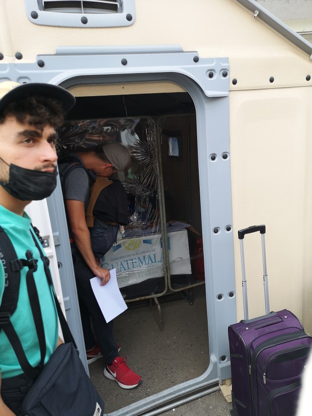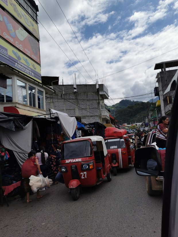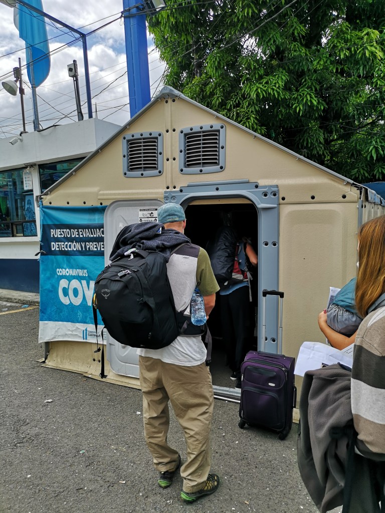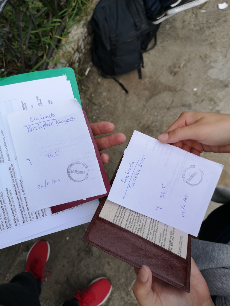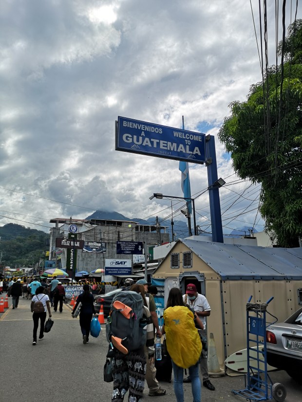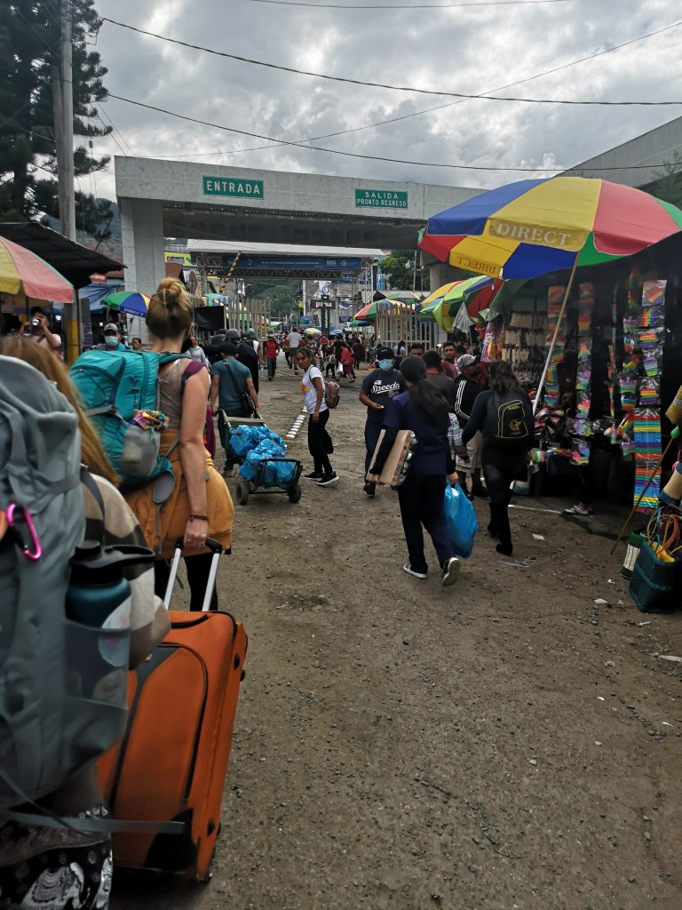 Nach der Pause quetschten wir uns erneut für ca. eine Stunde in den Bus, dann erreichten wir endlich die Auswanderungsbehörde. Hier benötigten wir unseren Pass und den Einwanderungsnachweis, den wir bei der Einreise in Mexiko erhalten hatten. Uns wurde gesagt, dass wir diesen Nachweis bis zu unserer Ausreise gut aufbewahren sollen – ein Mitreisender hatte diesen Nachweis verloren und musste deswegen 700 Pesos = 29,00 € bezahlen. Bei uns lief alles glatt und wir bekamen einen Stempel in unseren Pass, der unsere Ausreise aus Mexiko bestätigt. Nachdem alle überprüft waren, ging es weiter bis zur Grenze. Das letzte Stück mussten wir zu Fuß absolvieren. Wir gingen durch Straßen, gesäumt von Marktständen links und rechts und mittendrin war der Grenzübergang. Auf der guatemalischen Seite mussten wir als erstes in ein „Coronazelt“, in dem man unser Impfzertifikat kontrollierte und unsere Temperatur maß. Mit diesem Wert gingen wir weiter zum Einwanderungsschalter, an welchem wir den Einreisestempel für Guatemala erhielten. Danach hieß es mal wieder warten auf den Bus.