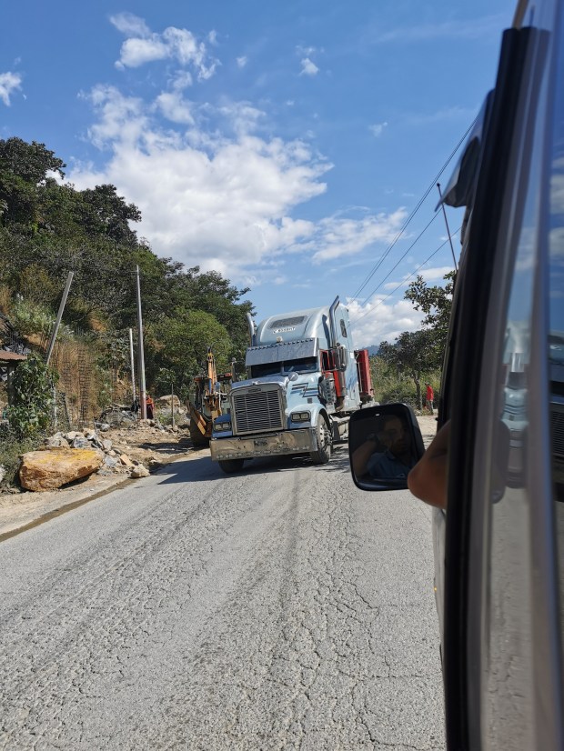 Als wir uns der Straßensperre näherten, waren wir froh in diesem Bus zu sitzen. Eine Gruppe von Leuten, alle hatten Masken auf und einen Stock in der Hand, sperrte mit einem Seil die Straße und verlangte von jedem Auto Geld.