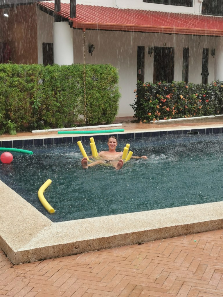 Das Wetter war herrlich und das Meer toll zum Baden (keine hohen Wellen). Später schauten wir uns noch einen zweiten Strand auf der anderen Seite der Bucht an. Dieser war genauso schön, jedoch mit höheren Wellen. Leider zogen am Nachmittag erneut Wolken auf, also packten wir unser Zeug zusammen und machten uns auf den Weg zurück zum Bus. Auf der Fahrt kamen wir in einen tropischen Regen. Es hat geschüttet wie aus Eimern. Auf den Straßen hatten sich rasch kleine Bäche gebildet und als die Bustür aufging standen wir direkt im Wasser. Krissi sprang aus dem Bus, zog sofort seine Schuhe aus und lief in Socken hoch zur Unterkunft. Hätte ich wohl auch machen sollen, denn meine Schuhe brauchten Tage um wieder trocken zu werden 😅. Da wir eh schon klatschschnass waren, sprang Krissi direkt in den Pool 😅