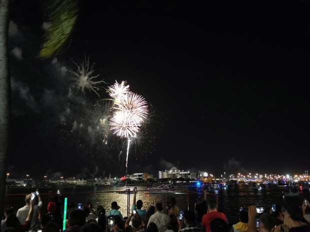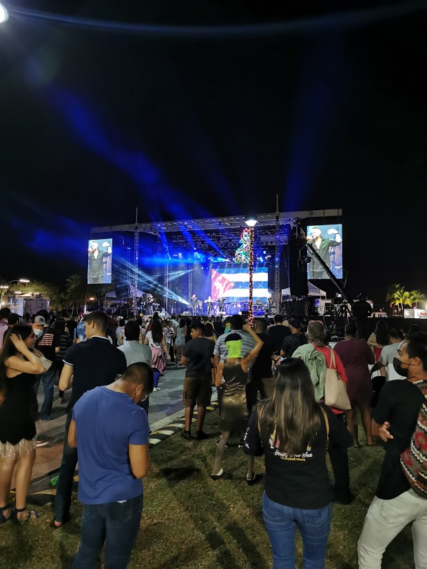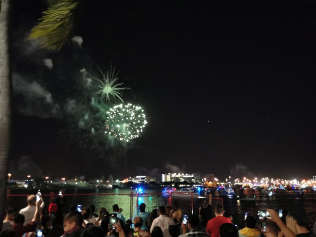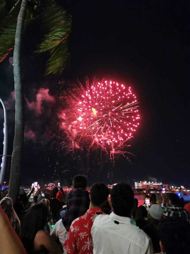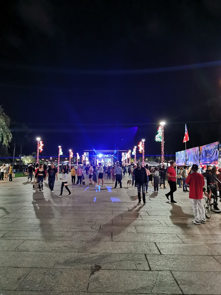 Um uns auf den Alkoholgenuss vorzubereiten, aßen wir noch Pizza bevor es endlich zur Party ging. Im Park angekommen war die Show bereits in vollem Gange. Zu unserer Enttäuschung war die gesamte Veranstaltung auf spanisch. Es war bereits jetzt schon einiges los und von der Sprache ließen wir uns den Abend nicht verderben. Wir vergnügten uns unter anderem damit, die Menschenmenge zu beobachten 😅 und unsere mitgebrachten Getränke zu konsumieren. Da die Zeit bis Mitternacht sehr langsam verging, machten wir uns zwischendurch erneut auf den Weg zum Supermarkt um unseren Getränkevorrat nachzufüllen. Um 23:00 Uhr kam ein DJ an die Reihe, der echt gute Musik auflegte und somit kamen wir doch noch zum Tanzen🕺. Kurz vor Mitternacht begaben wir uns näher ans Ufer um das Feuerwerk besser sehen zu können. Auch die Orange auf ihrem Weg nach oben war gut zu sehen und so zählten wir den Countdown 10 – 9 – 8 – 7 – 6 – 5 – 4 – 3 – 2 – 1 – HAPPY NEW YEAR!! Das Feuerwerk startete und es war beeindruckend 😍!