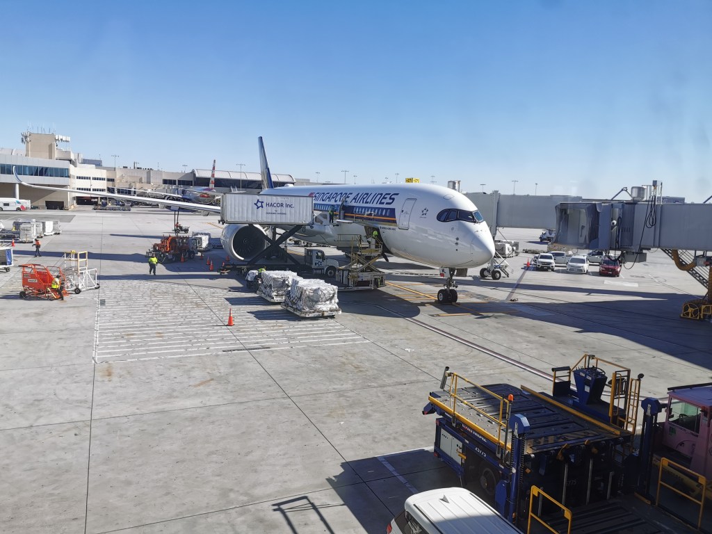 Um 17:30 Uhr (Ortszeit) landeten wir in Tokio, wo wir unseren ersten Zwischenstopp hatten. Für den einstündigen Aufenthalt fanden wir ein gemütliches Plätzchen und nutzten die Zeit, um mit unseren Eltern zu telefonieren. Die Zeit verging recht schnell und im Anschluss daran bestiegen wir für weitere sieben Stunden den Flieger nach Singapur. Leider war die Strecke gut gebucht und somit fast voll, doch trotz allem konnte Krissi die letzte freie Reihe ergattern und wir uns somit erneut ausbreiten.