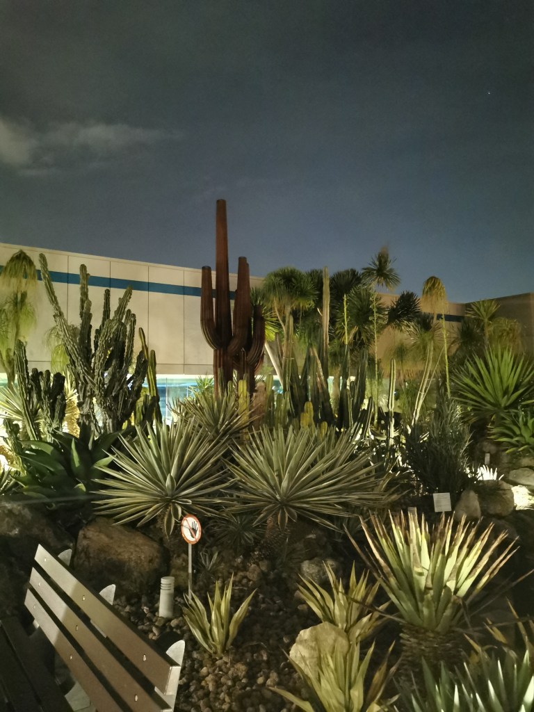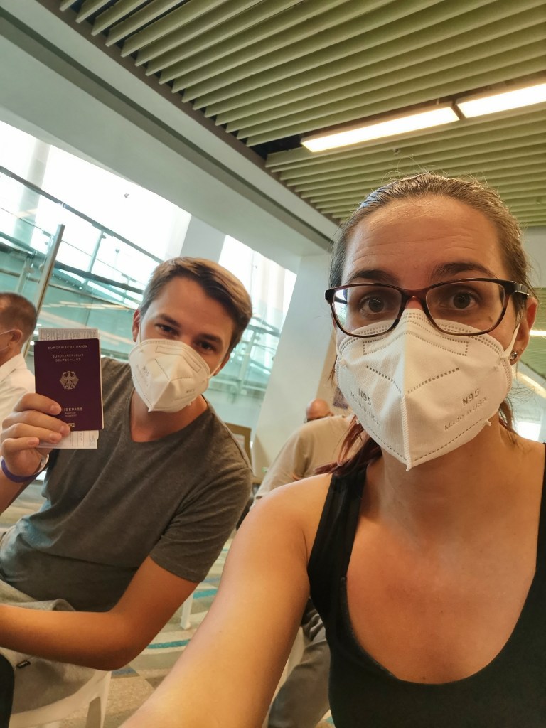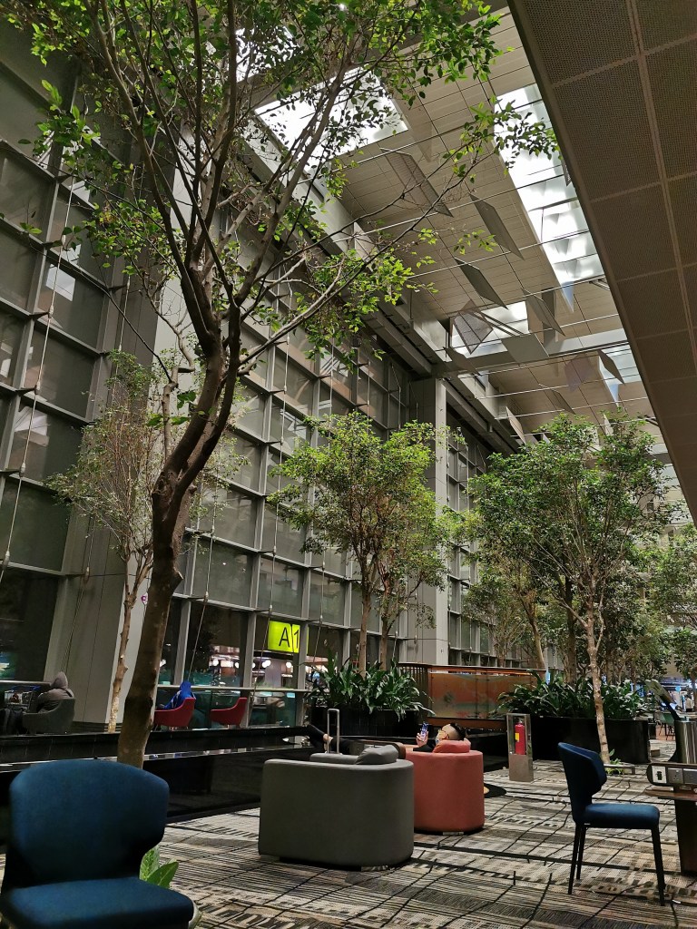 In Singapur hatten wir acht Stunden Aufenthalt. Bei der Buchung hatten wir uns auf diese Überbrückungszeit gefreut, denn der Flughafen hat normalerweise einiges zu bieten. Hier gibt es diverse Gärten, einen Pool und sogar einen Wasserfall, doch als wir ankamen, standen wir vor geschlossenen Türen. Am Informationsschalter wurde uns mitgeteilt, dass alle Attraktionen sowie die Duty-Free Shops aufgrund von Corona geschlossen sind. Lediglich der Kaktusgarten, welcher als Raucherzone dient, hatte geöffnet. Außerdem war neben drei sehr teuren Bistros die einzige Möglichkeit etwas zu Essen zu bekommen, ein kleiner Supermarkt. Hier konnten wir uns jeder zumindest ein Sandwich und was zu trinken kaufen. Neben einem Fischteich unter Bäumen, fanden wir eine nette Lounge, wo wir die nächsten Stunden verbringen konnten.