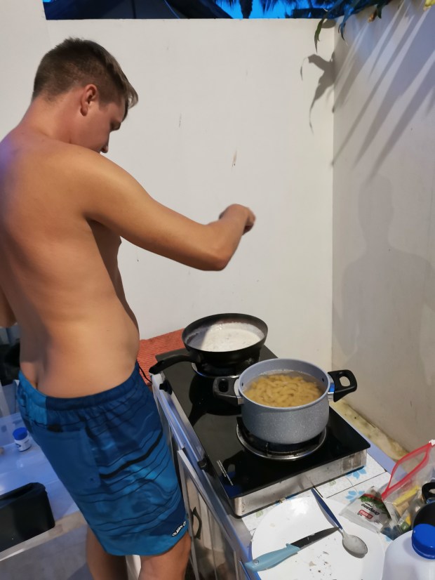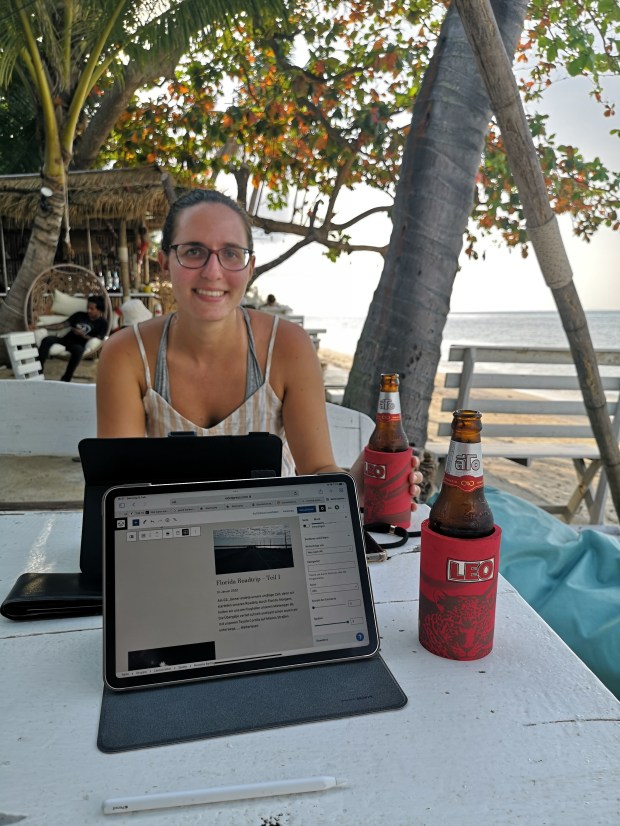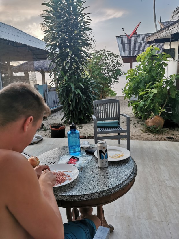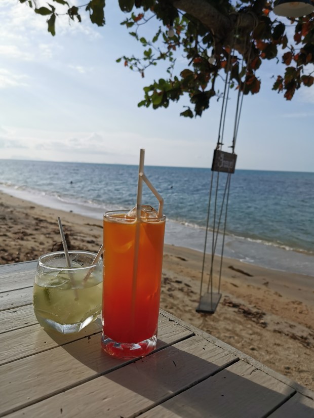 Uns kam der Gedanke, dass wir eventuell die Fähre nicht mehr erreichen würden und gleichzeitig fragten wir uns, warum die Agentur nicht einfach einen anderen Bus für uns schickt. Nach ca. einer Stunde kam dann doch ein anderer Van, der uns weiter brachte. Der Rest der Autofahrt verlief ohne Probleme und wir kamen trotz allem rechtzeitig am Hafen an. Es blieb uns sogar noch eine Stunde Zeit bis die Fähre ablegte, welche wir nutzten um eine Kleinigkeit zu Essen. Um 14:00 Uhr war es dann soweit und es hieß „Leinen los“. Wir verließen das Festland und nach fast zwei Stunden ruhiger Überfahrt, legten wir in Koh Samui an. Wir schnappten uns das erstbeste Taxi und fuhren zu unserer Unterkunft. Dort angekommen erfuhren wir, dass unser Haus erst ab dem vierten gebuchten Tag verfügbar ist und wir somit die ersten Nächte in einem anderen Bungalow übernachten mussten. Ein wenig enttäuscht brachten wir unser Gepäck in das Holzhaus und gingen direkt zum Meer, welches nur 10 Meter entfernt war. Am dritten Tag konnten wir in dann umziehen und erfreuten uns endlich über den Meerblick direkt von der Terrasse aus. Die ersten Tage nutzten wir für alltägliche Dinge wie Wäsche waschen und einkaufen, um mal wieder selbst kochen zu können. Außerdem verbrachten wir viel Zeit am Strand.