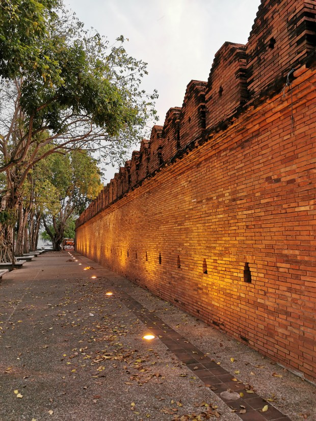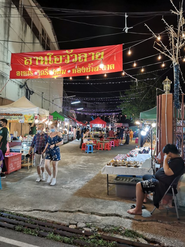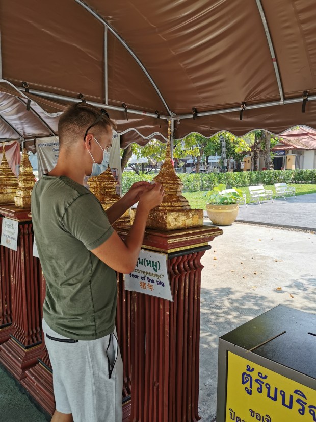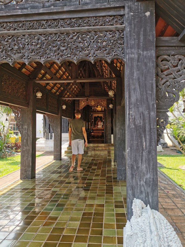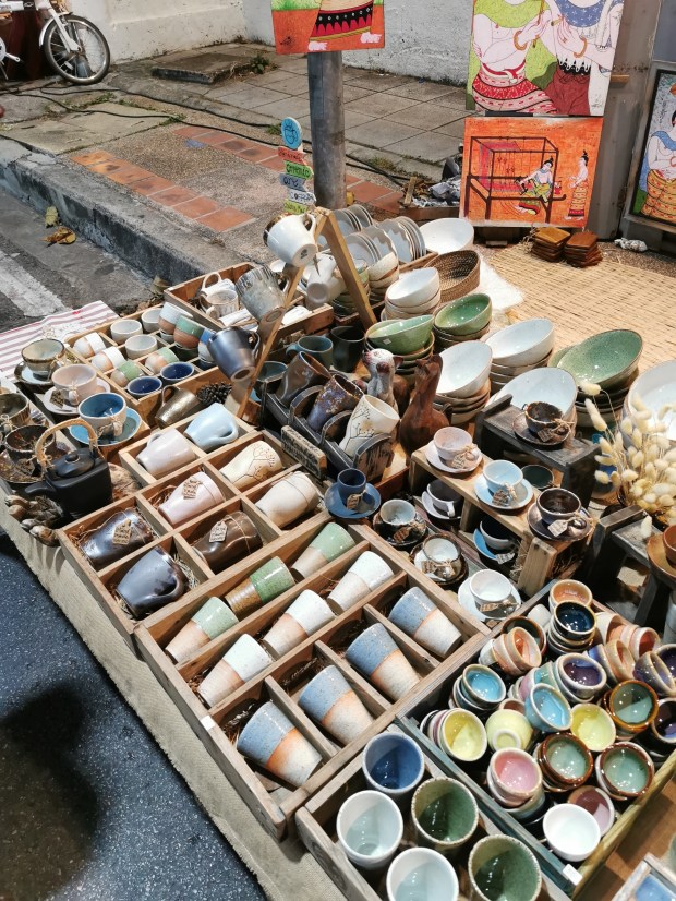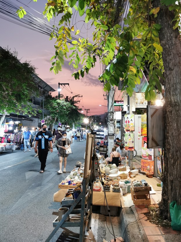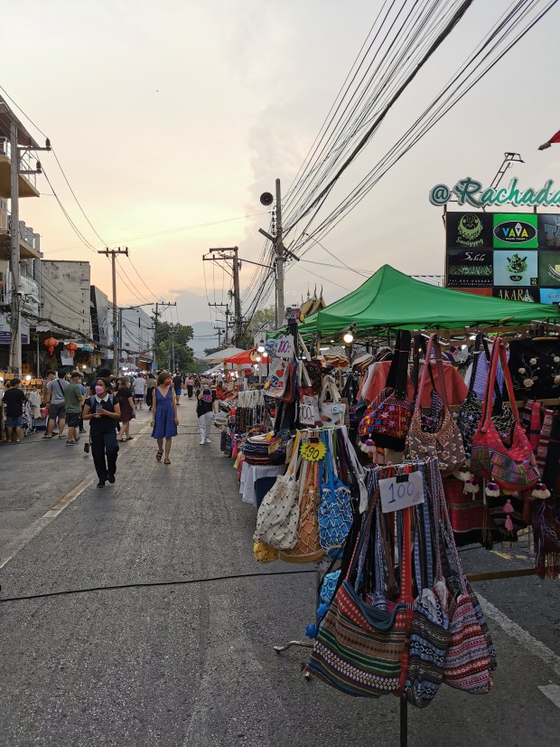 So erkundeten auch wir am ersten Tag eine von den rund 300 Anlagen. Erst dort bemerkten wir, wie unerträglich heiß es in der Sonne war. Also retteten wir uns von einem Schattenplatz zum nächsten durch die Tempelanlage. Nach ca. zwei Stunden beendeten wir die Tour und gingen in ein klimatisiertes Restaurant um etwas zu essen und uns ein wenig abzukühlen. Abends war es gottlob ein wenig angenehmer und wir besuchten einen „Nachtmarkt“, eine weitere Attraktion, die typisch für Chiang Mai ist. Dieser Markt war sehr beeindruckend. Obwohl wir auf unserer Reise schon viele Märkte gesehen haben, war dieser für uns der schönste. Es gab eine große Vielfalt an Produkten, welche von Kleidung, über Schmuck bis hin zu Handwerksarbeit reichte. Natürlich wurden auch verschiedenste Speisen angeboten. Hier sahen wir zum ersten Mal einen Stand mit frittierten Heuschrecken und Käfern – wir blieben jedoch bei unseren gebratenen Nudeln 🙈.