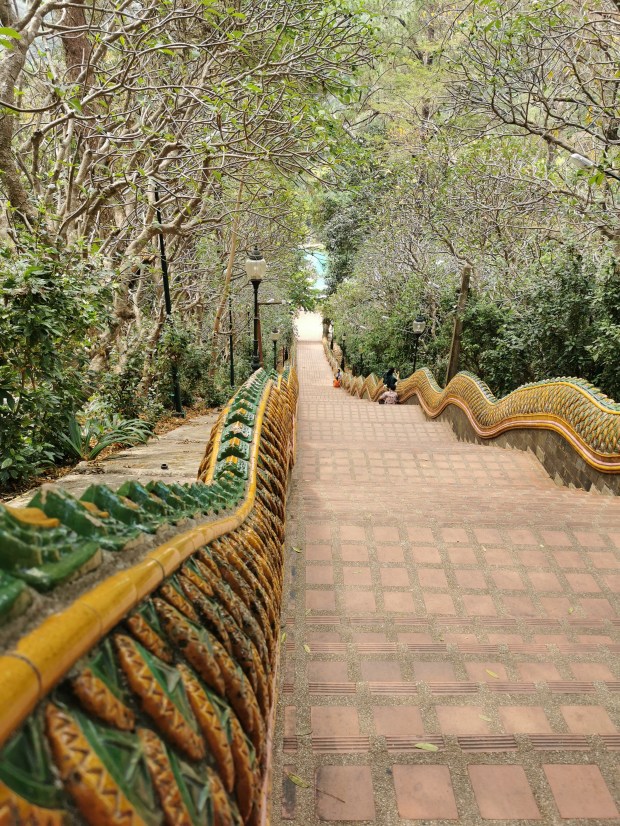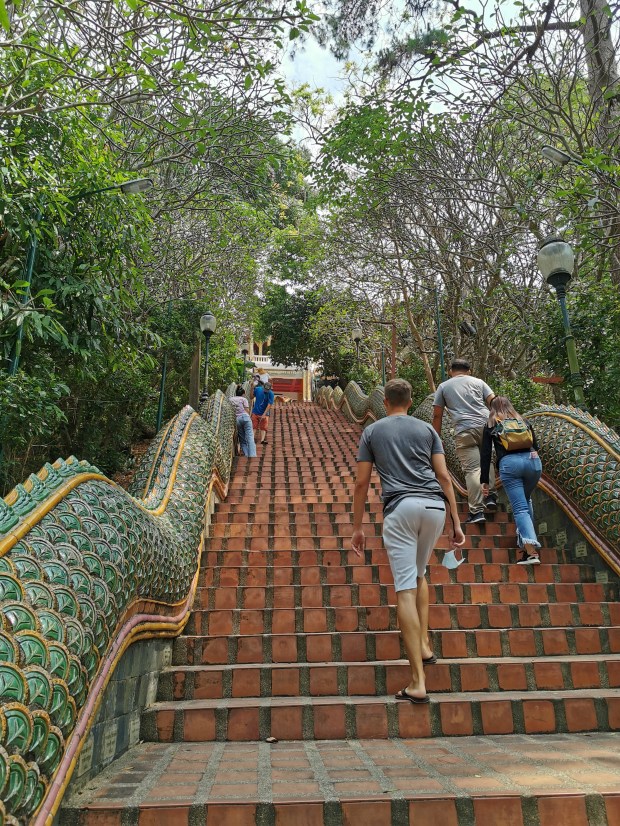 Zum Tempel führte eine Treppe, die auf beiden Seiten ein Geländer bestehend aus je einer Schlange mit 4 Köpfen hatte – daher der Name Schlangentreppe. Oben schmückten viele bunte Bäume das Gelände und es gab eine kleine Aussichtsplattform. In der Mitte stand ein riesiger goldener Chedi (ein Spitzer Turm) und überall zierten bunte Gemälde die Wände. Nachdem wir uns alles angesehen hatten, fuhren wir zurück.