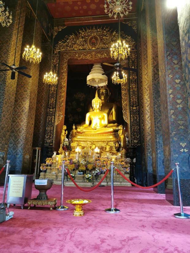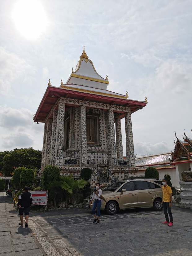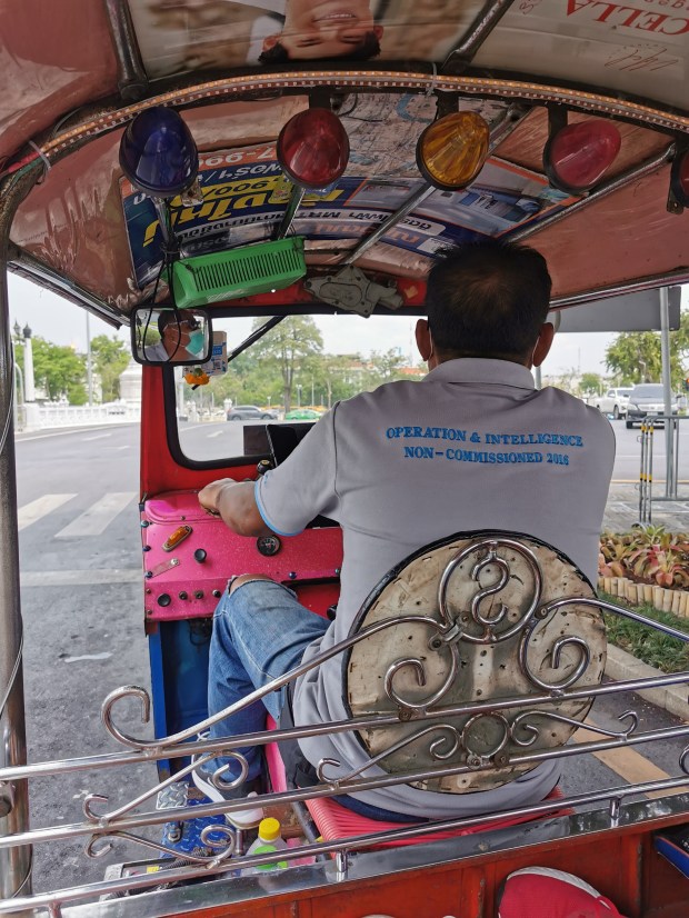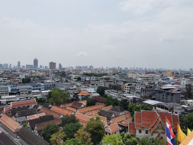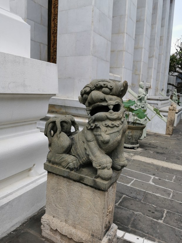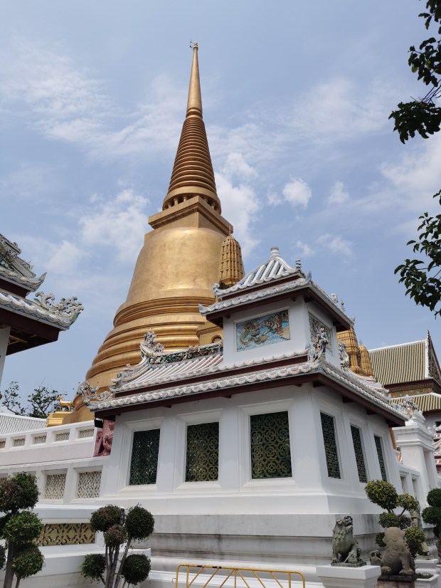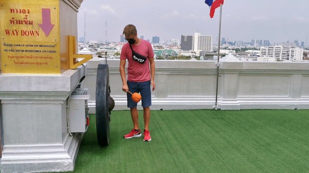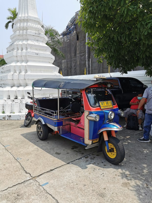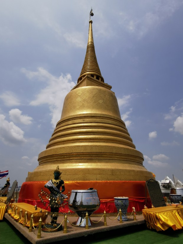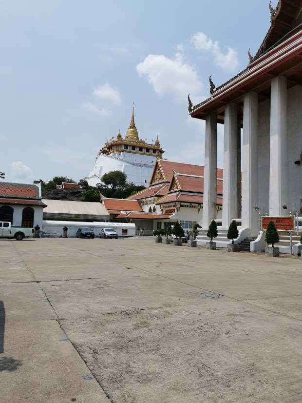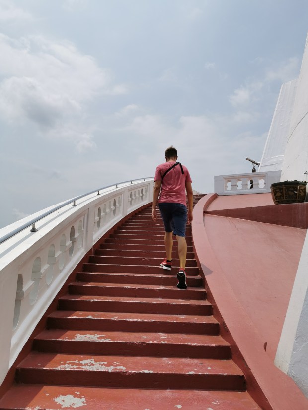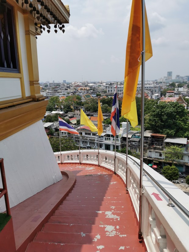 Den nächsten Tag wollten wir eigentlich im Königspalast verbringen. Doch es kam ganz anders. Nachdem wir aus dem Bus ausgestiegen und auf dem Weg zum Palast waren, sprach uns ein Mann an. Nach ein paar Worten erklärte er uns, dass der Palast heute geschlossen bleibt, da der König in die Stadt bzw. in den Palast kommt. Plötzlich holte er aus seiner Tasche einen Zettel und einen Stift heraus, zeichnete drei Tempel darauf und ging damit zu einem Tuk Tuk Fahrer. Schon hatten wir stattdessen eine Tagestour zu verschiedenen Tempeln organisiert bekommen. Zu unserer Freunde um wenig Geld, denn für das Tuk Tuk bezahlten wir nur 150 Baht = 4€. Der erste Tempel hieß „Wat Saket“ oder auch „Golden Mountain“. Unser Tuk Tuk Fahrer brachte uns zum Eingang und sagte, dass er am Parkplatz auf uns wartet. Ein wenig skeptisch waren wir schon ob der ganzen Situation. Wir fragten uns die ganze Zeit, ob der Fahrer wirklich zuverlässig warten würde. Ansonsten würden wir irgendwo mitten in Bangkok stehen und uns selbst um die Rückkehr kümmern müssen. Wir ließen es einfach auf uns zukommen und gingen die Treppenstufen hinauf zum Tempel. Oben angekommen hatten wir einen tollen Blick über Bangkok und konnten auch einen der vielen Gongs (siehe Bilder) schlagen hören – man sagt drei Schläge sollen Glück bringen 😊.