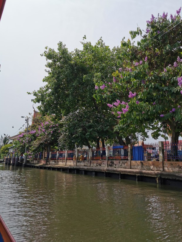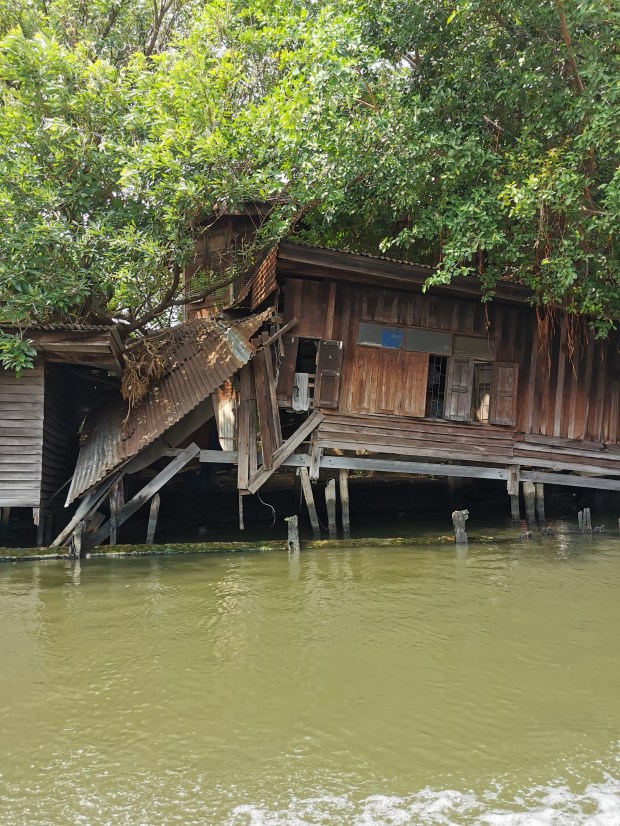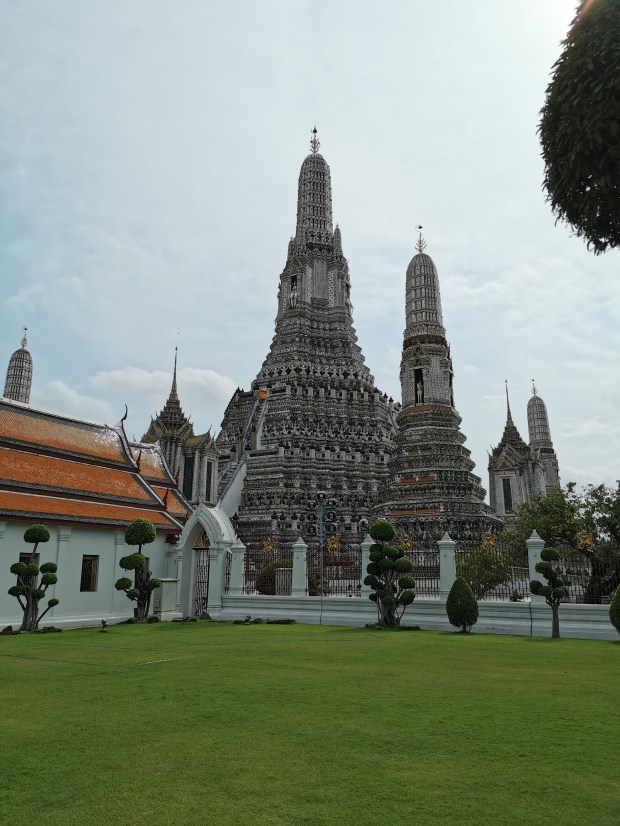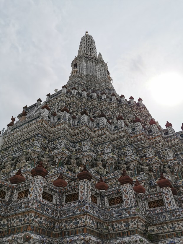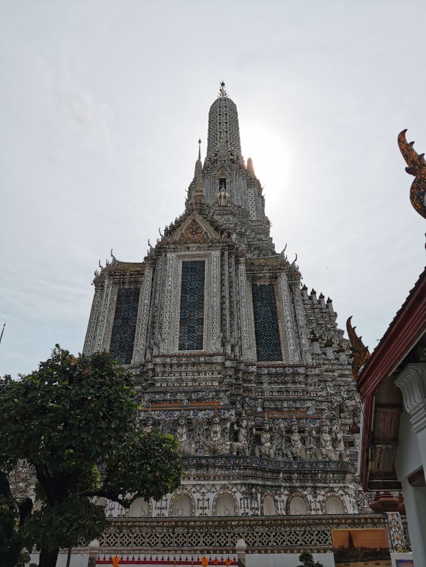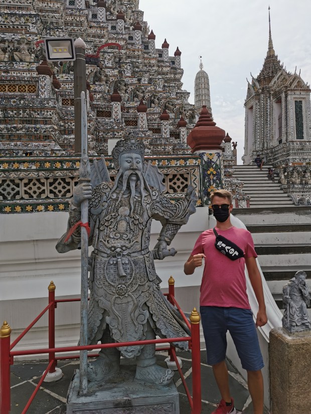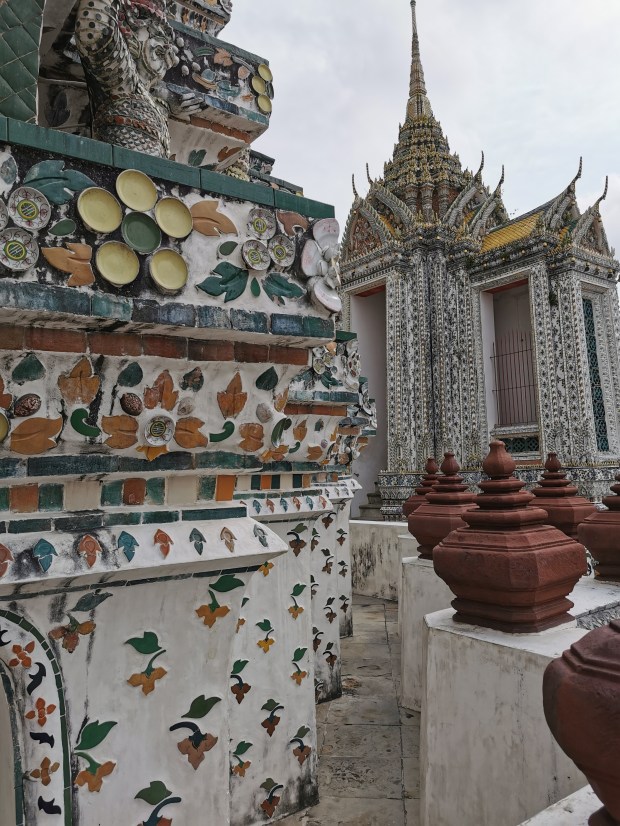 Der Mann auf dem Boot erklärte uns, dass wir eine kleine Rundfahrt durch die Kanäle von Bangkok bekommen und anschließend beim „Wat Arun“ Tempel aussteigen müssen. Wir konnten den Preis von 1500 auf 500 Baht = 13,30€ herunterhandeln und stiegen ein. Zuerst fuhren wir auf dem großen Fluss umher und waren ein wenig enttäuscht. Wir dachten uns: „für das Geld tuckern wir jetzt hier auf dem dreckigen Fluss herum und müssen uns mit den hohen Wellen der großen Schiffe herumschlagen“. Doch nach kurzer Zeit bogen wir in kleinere Kanäle ein. Was wir dort sahen, war beeindruckend. In den Kanälen von Bangkok herrscht ein ganz anderes Leben. Die Häuser sind auf Holzstelzen direkt ins Wasser gebaut und teilweise schon extrem in die Jahre gekommen. Viele hingen schief im Wasser oder waren schon komplett eingefallen. Dennoch konnten wir unsere Blicke auf einige Leute in ihren „Wohnzimmern“ werfen. Trotz dieser widrigen Bedingungen sahen sie glücklich aus. Für uns wäre es unvorstellbar hier zu leben. Nach einer guten Stunde Bootsfahrt kamen wir beim letztenTempel an. Hier mussten wir erneut Eintritt bezahlen. Alles in allem war der Tag doch nicht mehr so günstig wie wir anfangs dachten. Dieser Tempel war anders als die bisherigen. Hier war nichts vergoldet und wir konnten auch keine Buddha Statue finden. Stattdessen wurde er mit einer Art Mosaik verziert und die Figuren an der Wand erinnerten uns ein wenig an die Anlagen in Mexiko. Nachdem wir uns alles angesehen hatten, fuhren wir noch in die Khao San Road. Sie ist eine berühmte Partymeile und ein Backpackertreffpunkt. Da es aber erst 16 Uhr war, war hier noch nicht viel los. Nach einem kleinen Mittagessen und einem Fruchtshake nahmen wir den Bus nach Hause.