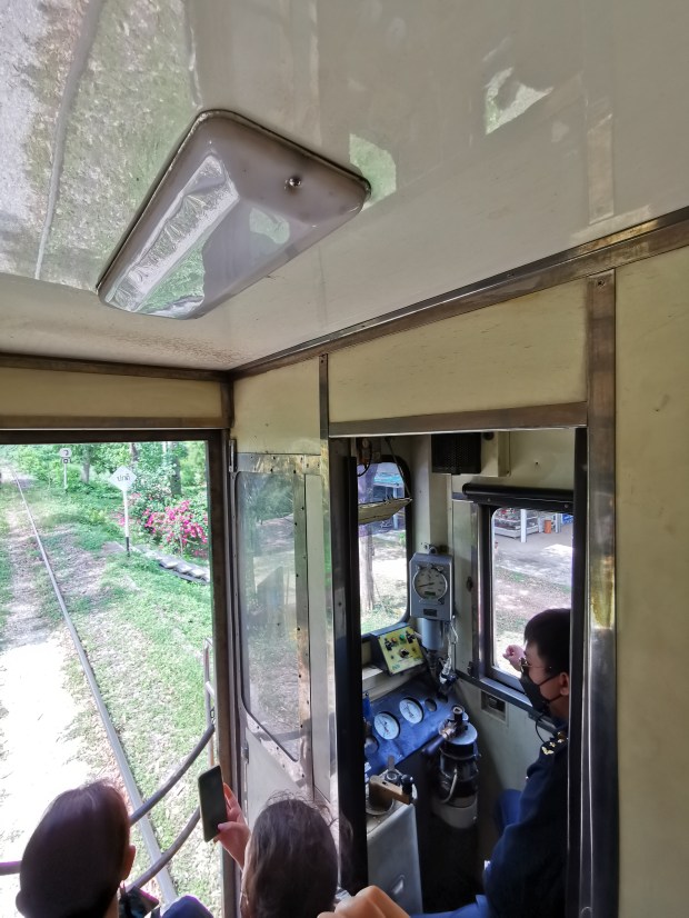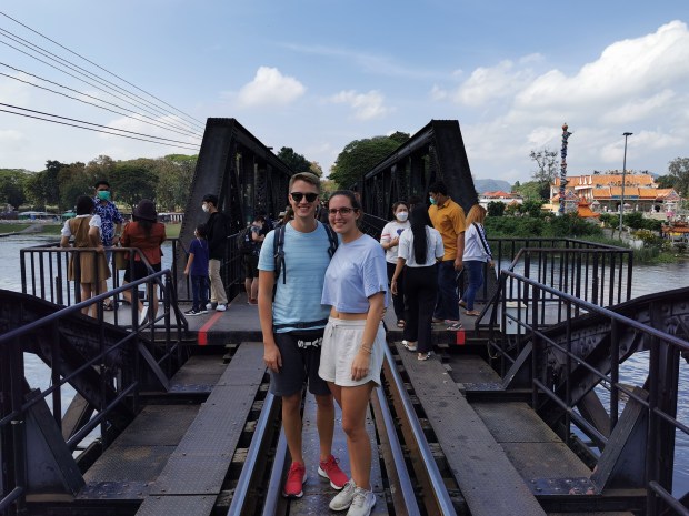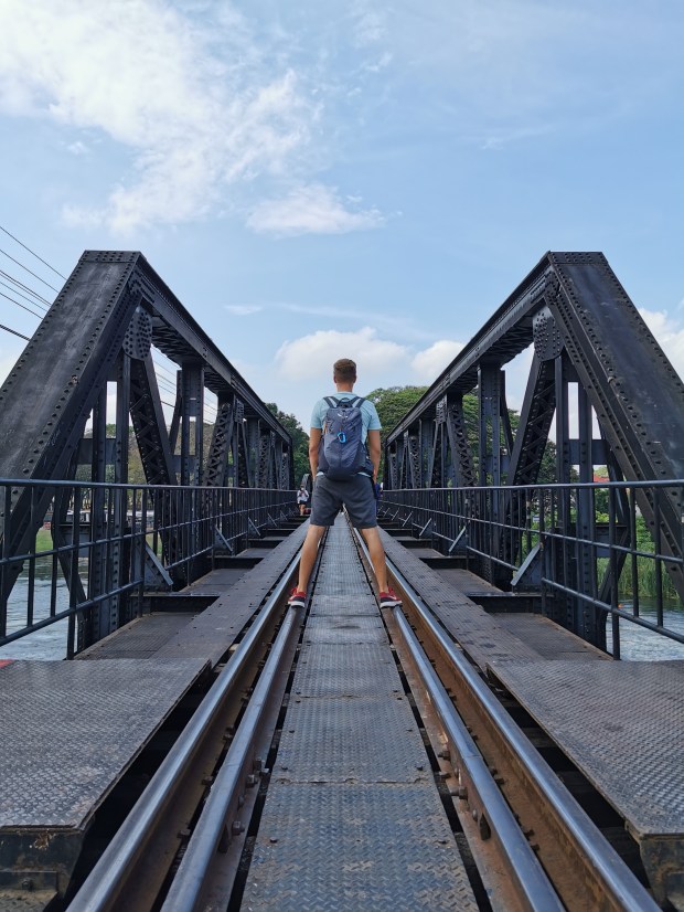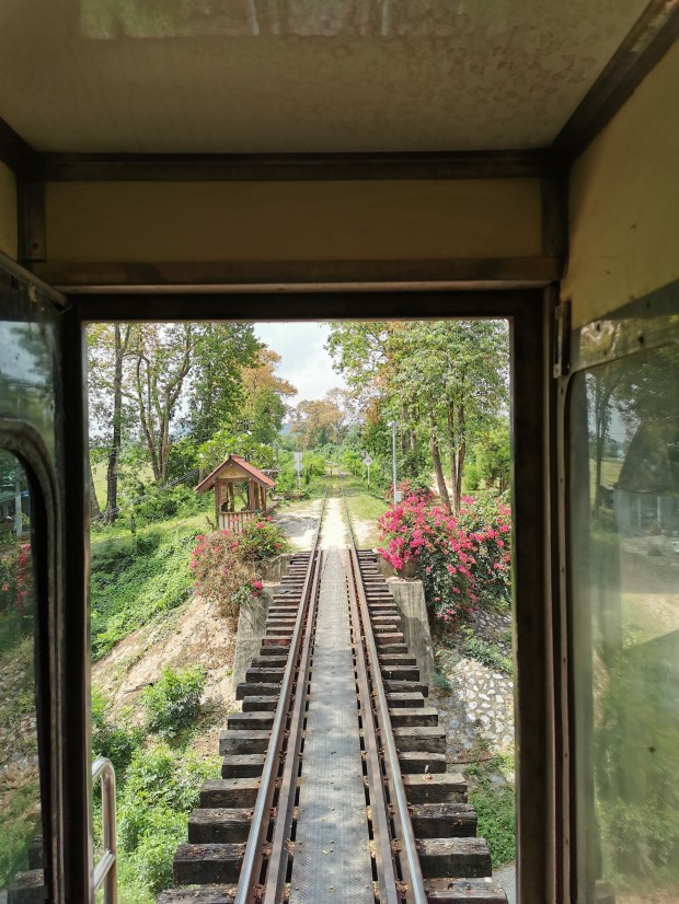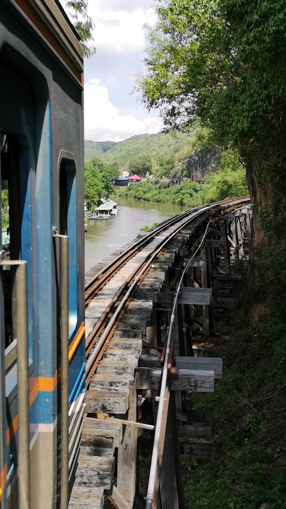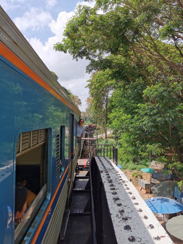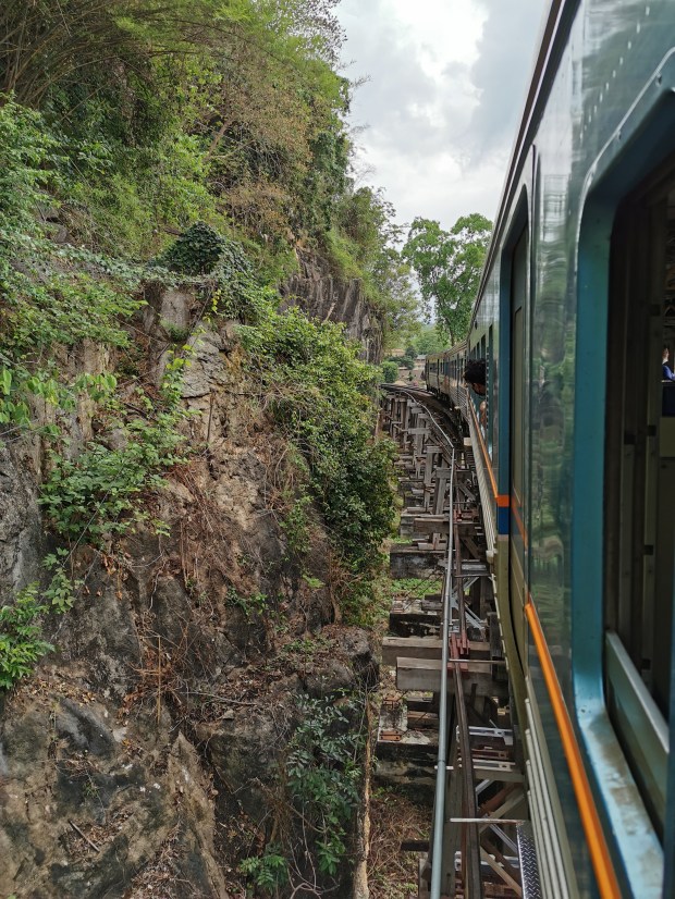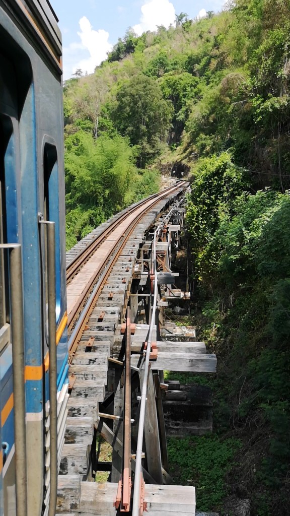Nach einer halben Stunde ging die Fahrt weiter und wir überquerten die Brücke. Müde von der kurzen Nacht versuchten wir ein wenig die Augen zu schließen. Plötzlich kam der Schaffner mit einem Megafon und brüllte uns direkt ins Ohr – erschrocken und leicht verärgert starrten wir ihn an und versuchten ihm zuzuhören. Leider konnten wir nichts verstehen da er Thai sprach. Nach der Durchsage kam er zu uns und erklärte uns, dass wir in den vorderen Teil des Zuges gehen sollen, denn wir würden in Kürze eine alte Holzbrücke überqueren. Gesagt, getan. So stapften wir hinter den anderen Passagieren hinterher. Als wir Vorne angekommen waren, lehnten wir uns aus den offenen Fenstern und bestaunten die alte Holzbrücke und die Umgebung. Wir fuhren auf einer uralten Holzkonstruktion knapp an einer Felswand vorbei. Da die Türe vorne neben dem Lokführer offen stand, konnten wir auch noch direkt auf die Gleise sehen. Von dort dauerte die Fahrt noch ca. 30 min.