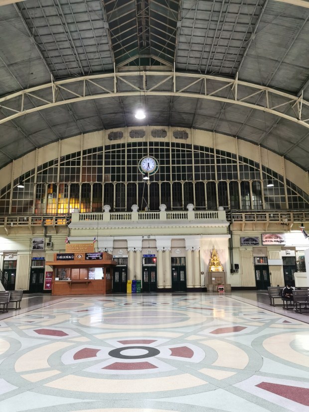 Nach 15 Minuten Fußmarsch erreichten wir die herausgefundene Busstation und stiegen in den nächsten Bus. „Wohin wollen Sie?“ kam die Frage des Busfahrers, „zum Bahnhof Hua Lamphong“ war unsere Antwort. „Okay, 23 Baht = 0,64€“. Sehr gut, dachten wir uns – dieser Bus fährt durch 😁.