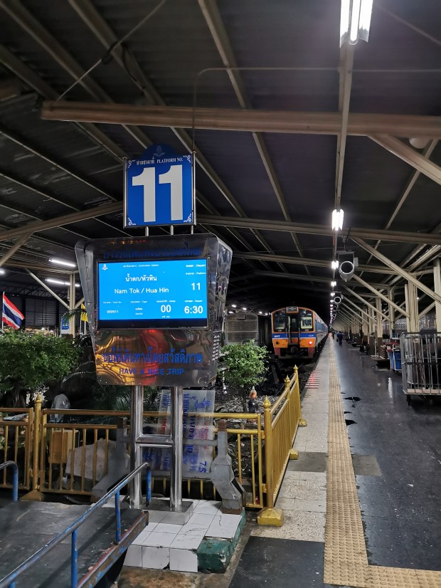 Viel zu früh saßen wir nun am Bahnhof und warteten auf die Abfahrt unseres Zuges nach „Nam Tok“. Nachdem wir noch von einem unbekannten Mann angequatscht wurden, stiegen wir in den Zug und warteten drinnen auf die Abfahrt. Wir hatten Tickets der 2. Klasse inklusive Klimaanlage gebucht. Leider, müsste man fast sagen, denn dass es da drinnen so kalt ist, damit hatten wir nicht gerechnet. Glücklicherweise hatten wir uns für den Notfall noch zwei Hemden mitgenommen. Zusammengekuschelt und mit den zusätzlichen Hemden zugedeckt, hörten wir um 06:30 Uhr das Signal des Zuges und die Fahrt ging los.