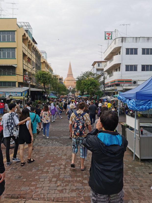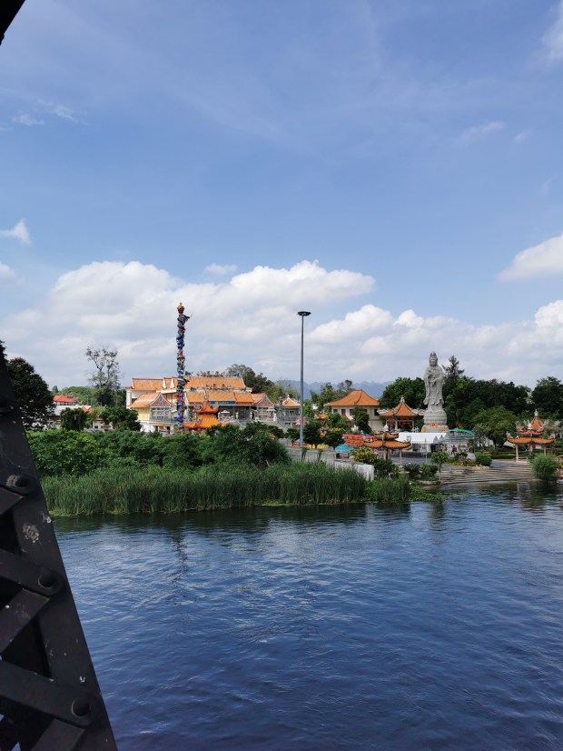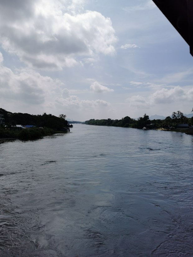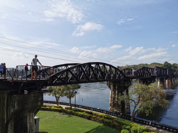 Erster Stopp war in dem Ort „Nakhom Pathom“. Hier hatten wir einen Aufenthalt von 30 Minuten. Da wir nicht wussten wohin wir gehen sollen, folgten wir einfach den anderen und gingen die Straße vom Bahnhof kommend geradeaus . Am Ende dieser Straße stand ein großer Chedi (eine kleine spitze Tempelanlage). Wir machten ein paar Fotos und nutzten die dortigen Toilettanlagen. Rasch gingen wir wieder zurück zum Bahnhof. Unterwegs kauften wir uns noch ein paar Snacks für die Fahrt. Der Zug fuhr ein, wir nahmen erneut Platz und der Motor wurde wieder gestartet. Der nächste Halt war der eigentliche Grund weshalb wir diese Tour gebucht hatten – „die Brücke am Kwai“. Wir stiegen aus und schauten sie uns näher an. Sie wurde im zweiten Weltkrieg gebaut um Thailand mit dem Bahnnetzwerk in Burma zu verbinden. Von Burma aus wurden Versorgungszüge nach Thailand geschickt, um den langen und riskanten Seeweg zu vermeiden.