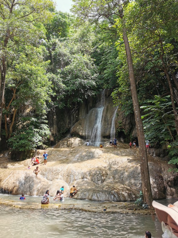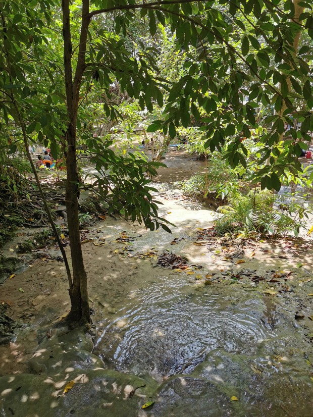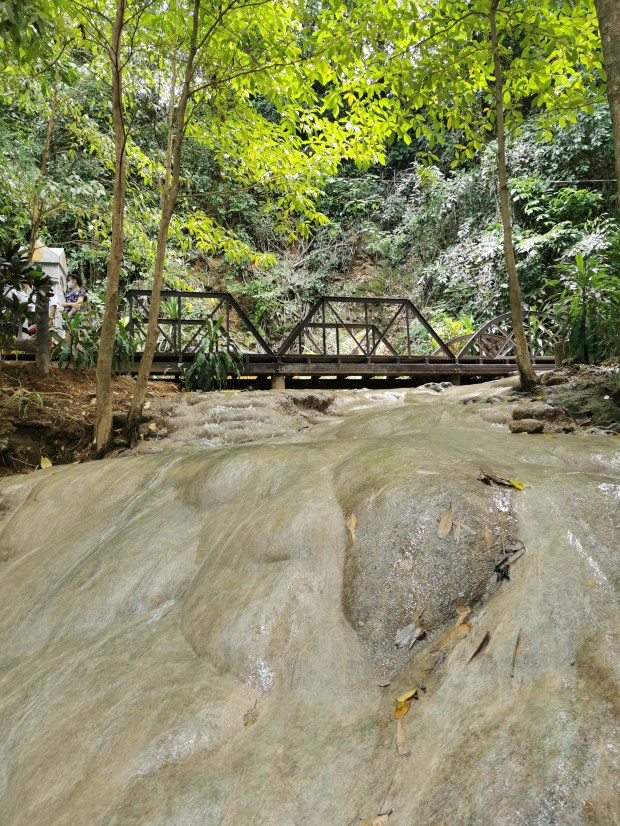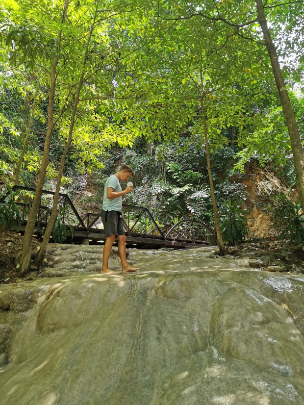 Das Wasser verläuft über Kalksteine in viele kleine Becken. Da es leider sehr trüb war, sah es nicht wirklich einladend zum Schwimmen aus. Trotzdem stiegen wir mit einem Fruchtshake in der Hand in ein etwas saubereres kleines Becken und ließen uns das Wasser zur Abkühlung über die Füße laufen.