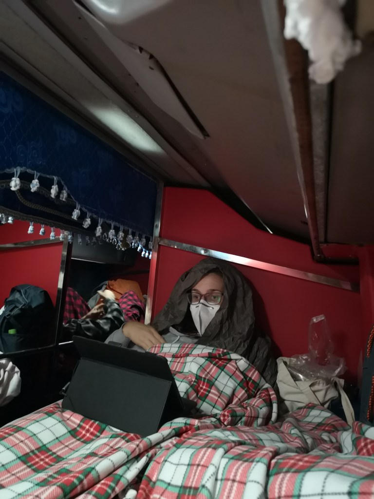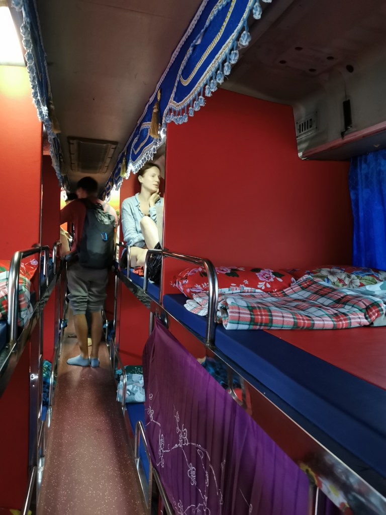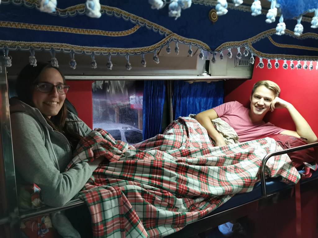 Tja, leider war es nicht so – als wir in den Bus stiegen mussten wir feststellen, dass wir uns eine Schlafkoje teilen müssen. Die Koje war ca. 1,90 Meter lang und 90 cm breit. Da wir beide groß sind wussten wir nicht wohin mit unseren Beinen und unsere Rucksäcke mussten wir auch noch zwischen uns unterbringen. Während der Fahrt wurde es auch immer kälter und wir nutzten alle Dinge die wir dabei hatten um uns warm zu halten.