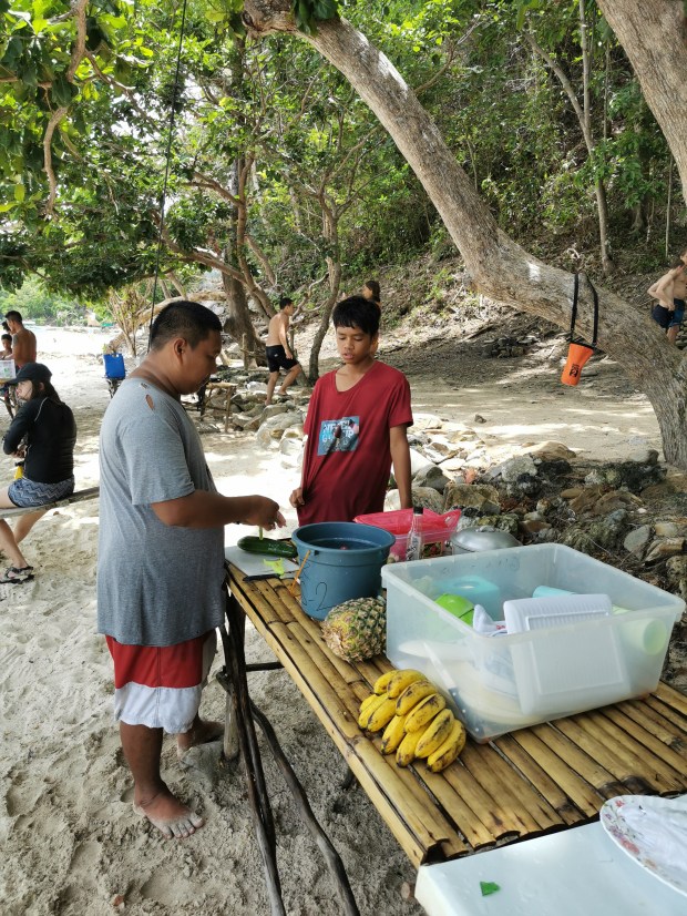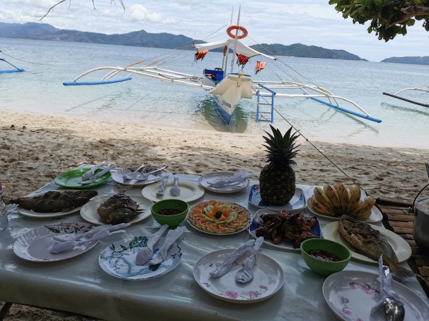 Wir unterstützten einen Einheimischen und buchten bei ihm eine Schnorchel Tour. Sein Boot ist Gott sei Dank von dem Taifun verschont geblieben. Somit konnten wir mit einem typischen philippinischen Boot fahren. An mehreren Spots waren Halte zum Schnorcheln eingeplant und wir bekamen ein hervorragendes Mittagessen. Es gab frisch gegrillten Fisch, Hühnchen und jede Menge Obst.