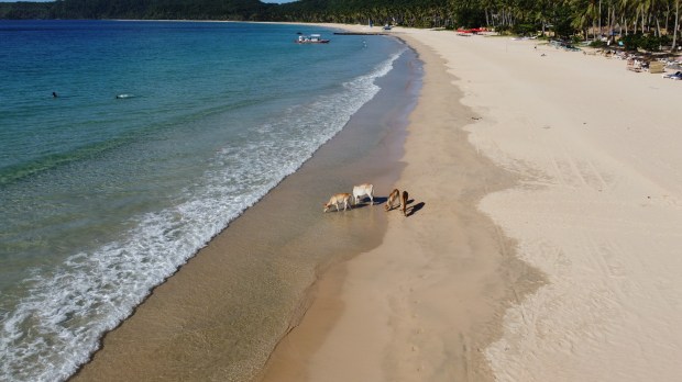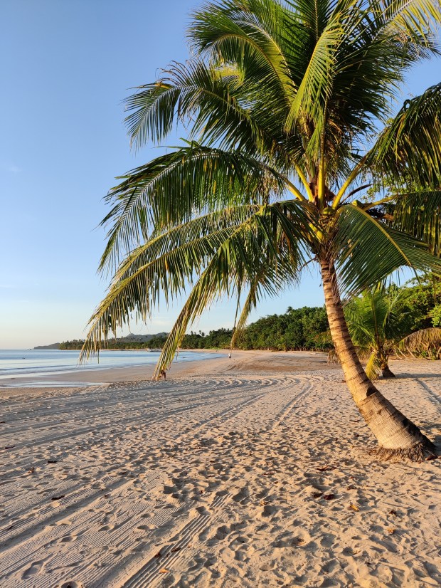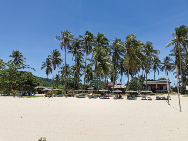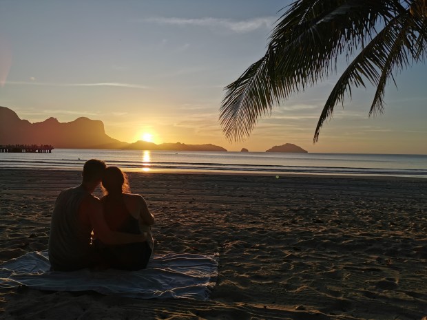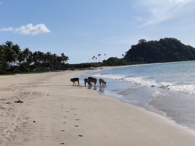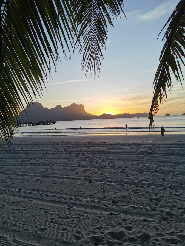 Neben den Touren (dazu kommen extra Beiträge) und dem Entspannen am nahe gelegenen Strand, machten wir an einem Tag einen Ausflug zum „Nacpan Beach“. Dafür holte uns ein Tuk-Tuk ab und wir fuhren über die holprigen Straßen zum Strand. Da die meisten Tuk-Tuks hier nur für zwei Mitfahrer ausgelegt sind, nahm Conny hinter dem Fahrer auf dem Moped Platz. Bequem war es zwar nicht, aber eine lustige Fahrt. Dieser Strand war ein traumhafter, ewig langer Sandstrand mit ein paar kleinen Bars und Restaurants. Da es hier keinen natürlichen Schatten gab, mieteten wir uns Liegen mit Sonnenschirmen und genossen den Tag mit kühlen Cocktails im Schatten. Eine Besonderheit am Strand waren die Kühe, die gegen Abend erschienen, was für uns eine neue Erfahrung war. Sie spazierten gemütlich über den Sand und kühlten ihre Hufe im Meer 😅. Zum Bestaunen eines Sonnenuntergangs wurde uns von unserem Tuk-Tuk Fahrer der „Lio Beach“ empfohlen, da dort der Sonnenuntergang außergewönlich schön sein soll. Trotzdem wir schon viele wunderbare Sonnenuntergänge gesehen hatten, wollten wir uns diesen natürlich nicht entgehen lassen. Er bot uns an auf uns zu warten um uns kurz vor Sonnenuntergang dort hin bringen zu können. Uns wurde nicht zu viel versprochen, denn der Sonnenuntergang war echt sehenswert.
